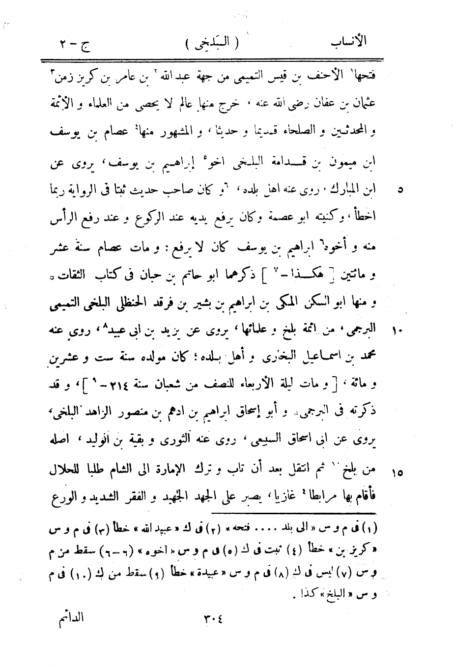 فتحها [1] الأحنف بن قيس التميمي من جهة عبد الله [2] بن عامر بن كريز زمن [3] عثمان بن عفان رضى الله عنه، خرج منها عالم لا يحصى من العلماء والأئمة والمحدثين والصلحاء قديما وحديثا، والمشهور منها [4] عصام بن يوسف ابن ميمون بن قدامة البلخي أخو [5] إبراهيم بن يوسف، يروى عن ابن المبارك، روى عنه أهل بلده، [6] وكان صاحب حديث ثبتا في الرواية ربما اخطأ، وكنيته ابو عصمة وكان يرفع يديه عند الركوع وعند رفع الرأس منه وأخوه [6] إبراهيم بن يوسف كان لا يرفع، ومات عصام سنة عشر ومائتين [هكذا-[7]] ذكرهما ابو حاتم بن حبان في كتاب الثقات ومنها ابو السكن المكيّ بن إبراهيم بن بشير بن فرقد الحنظليّ البلخي التميمي البرجمي، من أئمة بلخ وعلمائها، يروى عن يزيد بن ابى عبيد [8] ، روى عنه محمد بن إسماعيل البخاري وأهل بلده، كان مولده سنة ست وعشرين ومائة، [ومات ليلة الأربعاء للنصف من شعبان سنة 214-[9]] ، وقد ذكرته في البرجمي وأبو إسحاق إبراهيم بن ادهم بن منصور الزاهد البلخي، يروى عن ابى إسحاق السبيعي، روى عنه الثوري وبقية بن الوليد، أصله من بلخ [10] ثم انتقل بعد أن تاب وترك الإمارة الى الشام طلبا للحلال فأقام بها مرابطا [4] غازيا، يصبر على الجهد الجهيد والفقر الشديد والورع
