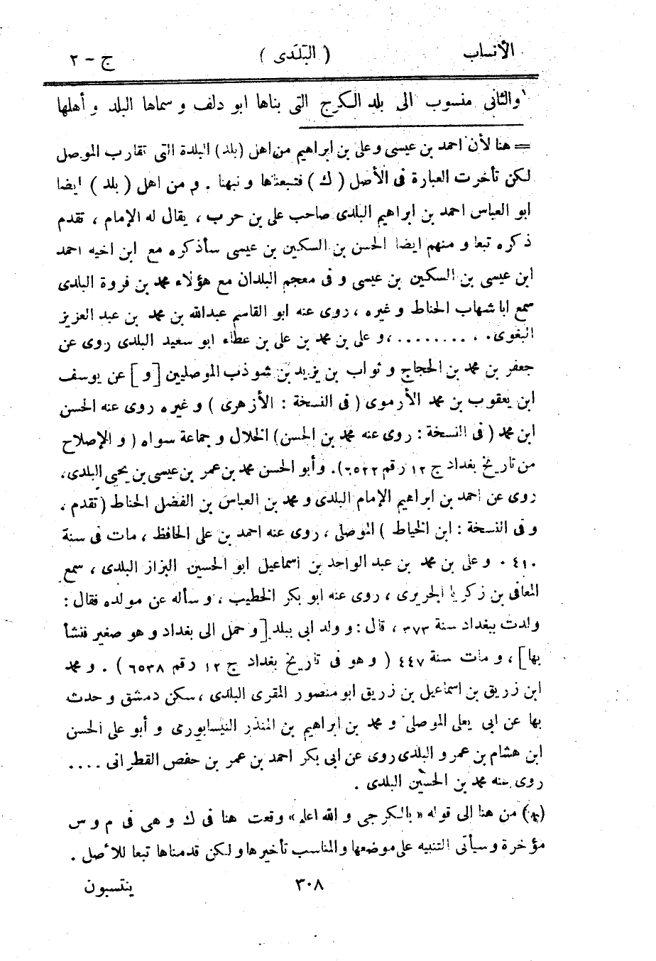 [ (-) ] هنا لأن احمد بن عيسى وعلى بن إبراهيم من أهل (بلد) البلدة التي تقارب الموصل لكن تأخرت العبارة في الأصل (ك) فتبعناها ونبهنا. ومن أهل (بلد) أيضا ابو العباس احمد بن إبراهيم البلدي صاحب على بن حرب، يقال له الإمام، تقدم ذكره تبعا ومنهم أيضا الحسن بن السكين بن عيسى سأذكره مع ابن أخيه احمد ابن عيسى بن السكين بن عيسى وفي معجم البلدان مع هؤلاء محمد بن فروة البلدي سمع ابا شهاب الحناط وغيره، روى عنه ابو القاسم عبد الله بن محمد بن عبد العزيز البغوي.، ... ، وعلى بن محمد بن على بن عطاء ابو سعيد البلدي روى عن جعفر بن محمد بن الحجاج وثواب بن يزيد بن شوذب الموصليين [و] عن يوسف ابن يعقوب بن محمد الأرموي (في النسخة: الأزهري) وغيره روى عنه الحسن ابن محمد (في النسخة: روى عنه محمد بن الحسن) الخلال وجماعة سواه (والإصلاح من تاريخ بغداد ج 12 رقم 6522) . وأبو الحسن محمد بن عمر بن عيسى بن يحيى البلدي، روى عن احمد بن إبراهيم الإمام البلدي ومحمد بن العباس بن الفضل الحناط (تقدم، وفي النسخة: ابن الخياط) الموصلي، روى عنه احمد بن على الحافظ، مات في سنة 410. وعلى بن محمد بن عبد الواحد بن إسماعيل ابو الحسين البزاز البلدي، سمع المعافى بن زكريا الجريريّ، روى عنه ابو بكر الخطيب، وسأله عن مولده فقال: