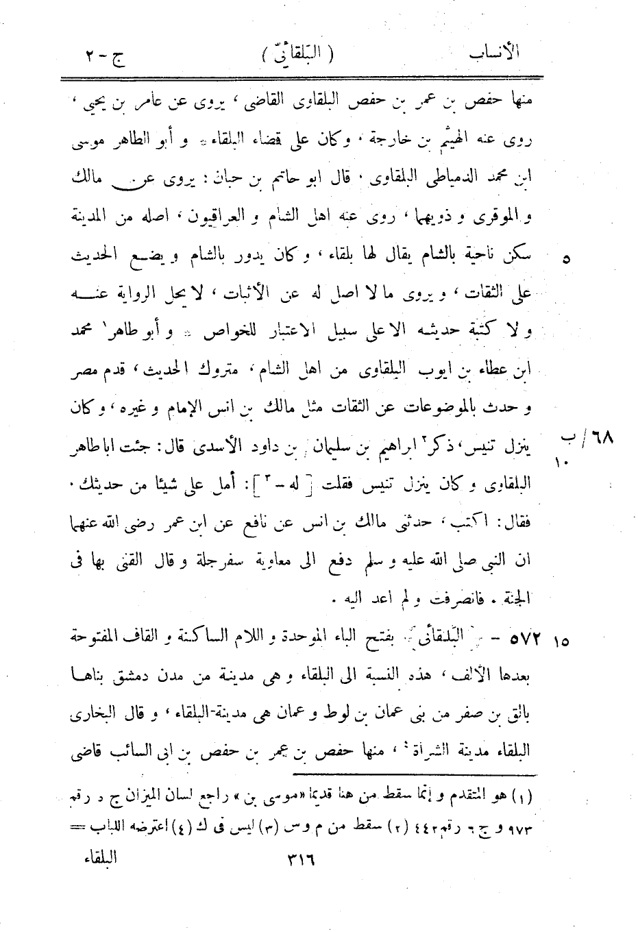 منها حفص بن عمر بن حفص البلقاوي القاضي، يروى عن عامر بن يحيى، روى عنه الهيثم بن خارجة، وكان على قضاء البلقاء وأبو الطاهر موسى ابن محمد الدمياطيّ البلقاوي، قال ابو حاتم بن حبان، يروى عن مالك والموقرى وذويهما، روى عنه أهل الشام والعراقيون، أصله من المدينة سكن ناحية بالشام يقال لها بلقاء، وكان يدور بالشام ويضع الحديث على الثقات، ويروى ما لا أصل له عن الأثبات، لا يحل الرواية عنه ولا كتبة حديثه الا على سبيل الاعتبار للخواص وأبو طاهر [1] محمد ابن عطاء بن أيوب البلقاوي من أهل الشام، متروك الحديث، قدم مصر وحدث بالموضوعات عن الثقات مثل مالك بن انس الإمام وغيره، وكان 68/ ب ينزل تنيس، ذكر [2] إبراهيم بن سليمان/ بن داود الأسدي قال: جئت ابا طاهر البلقاوي وكان ينزل تنيس فقلت [له-[3]] : أمل على شيئا من حديثك.