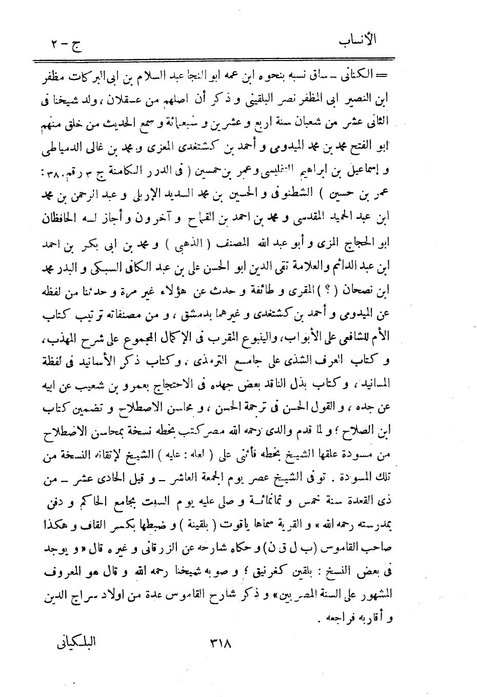 [ (-) ] الكناني- ساق نسبه بنحوه ابن عمه ابو النجا عبد السلام بن ابى البركات مظفر ابن النصير ابى المظفر نصر البلقيني وذكر أن أصلهم من عسقلان، ولد شيخنا في الثاني عشر من شعبان سنة اربع وعشرين وسبعمائة وسمع الحديث من خلق منهم ابو الفتح محمد بن محمد الميدومى وأحمد بن كشتغدى المعزى ومحمد بن غالى الدمياطيّ وإسماعيل بن إبراهيم التفليسي وعمر بن حمسين (في الدرر الكامنة ج 3 رقم 380: