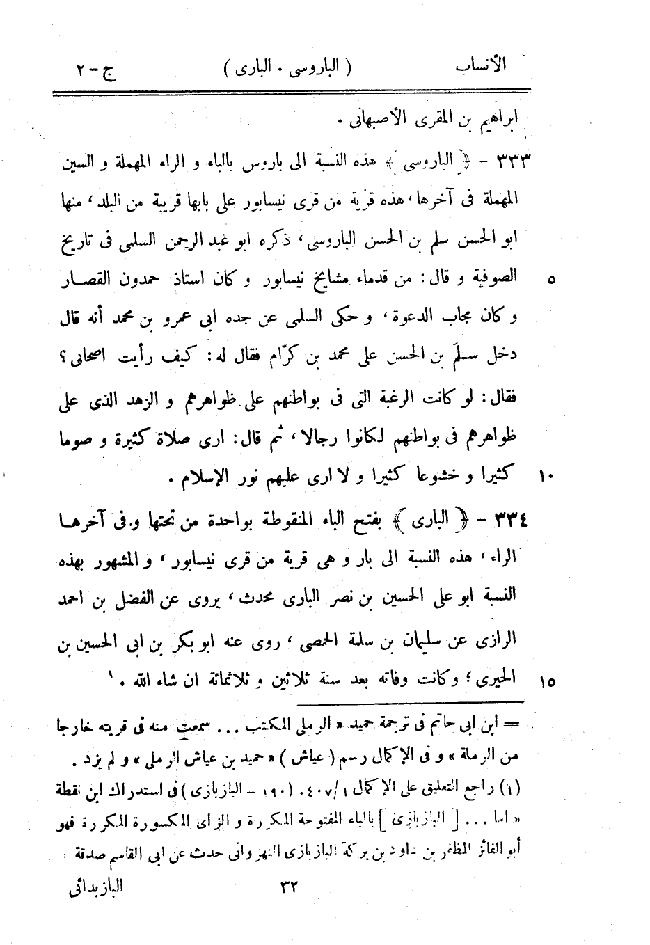 بفتح الباء المنقوطة بواحدة من تحتها وفي آخرها الراء، هذه النسبة الى بار وهي قرية من قرى نيسابور، والمشهور بهذه النسبة ابو على الحسين بن نصر الباري محدث، يروى عن الفضل بن احمد الرازيّ عن سليمان بن سلمة الحمصي، روى عنه ابو بكر بن ابى الحسين بن الحيريّ، وكانت وفاته بعد سنة ثلاثين وثلاثمائة ان شاء الله. [1]