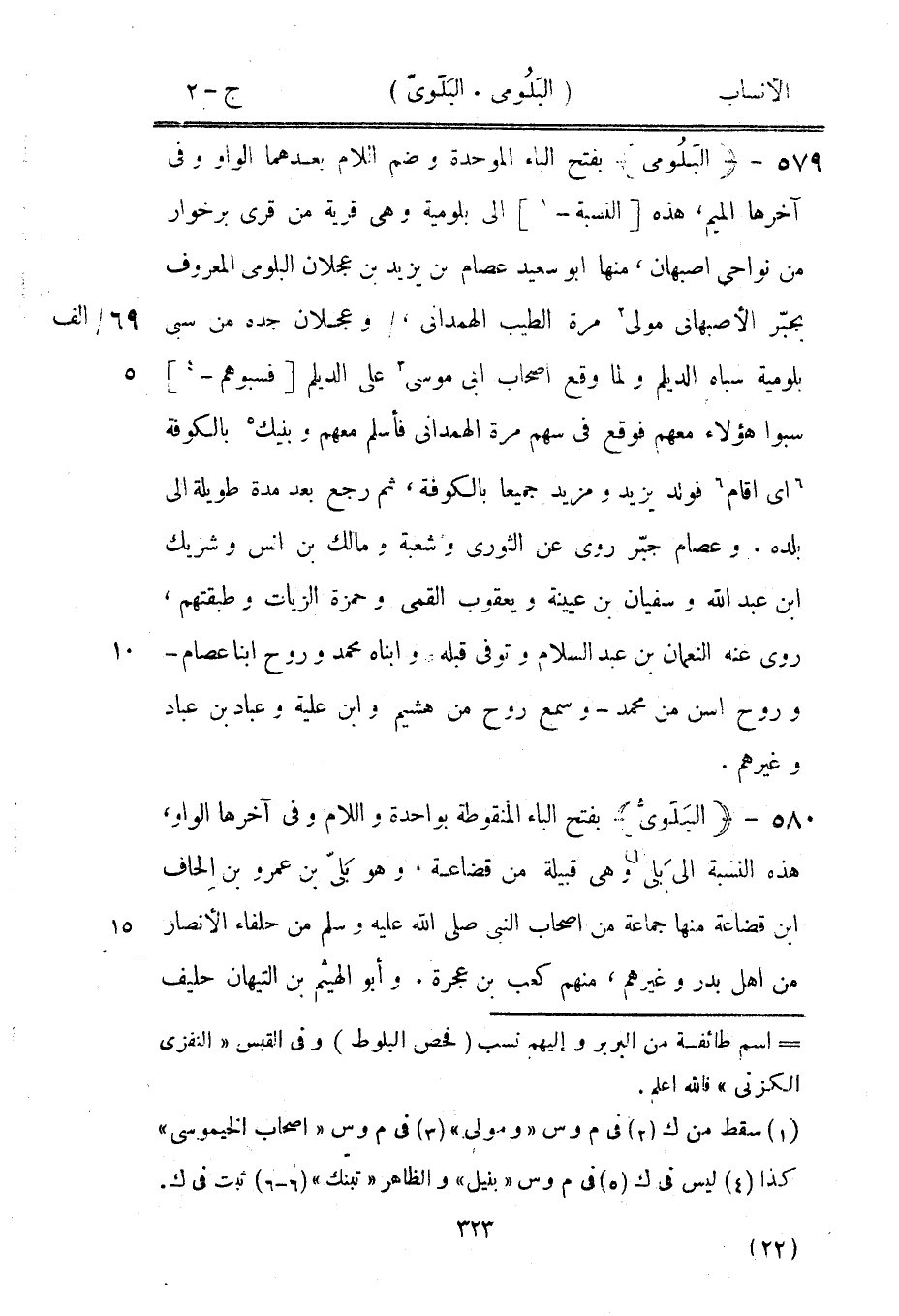 بفتح الباء الموحدة وضم اللام بعدهما الواو وفي آخرها الميم، هذه [النسبة-[1]] الى بلومية وهي قرية من قرى برخوار من نواحي أصبهان، منها ابو سعيد عصام بن يزيد بن عجلان البلومى المعروف بجبّر الأصبهاني مولى [2] مرة الطيب الهمدانيّ،/ وعجلان جده من سبى 69/ ألف بلومية سباه الديلم ولما وقع أصحاب ابى موسى [3] على الديلم [فسبوهم-[4]] سبوا هؤلاء معهم فوقع في سهم مرة الهمدانيّ فأسلم معهم وبنيك [5] بالكوفة [6] اى اقام [6] فولد يزيد ومزيد جميعا بالكوفة، ثم رجع بعد مدة طويلة الى بلده. وعصام جبّر روى عن الثوري وشعبة ومالك بن انس وشريك ابن عبد الله وسفيان بن عيينة ويعقوب القمي وحمزة الزيات وطبقتهم، روى عنه النعمان بن عبد السلام وتوفى قبله وابناه محمد وروح ابنا عصام- وروح أسن من محمد- وسمع روح من هشيم وابن علية وعباد بن عباد وغيرهم.