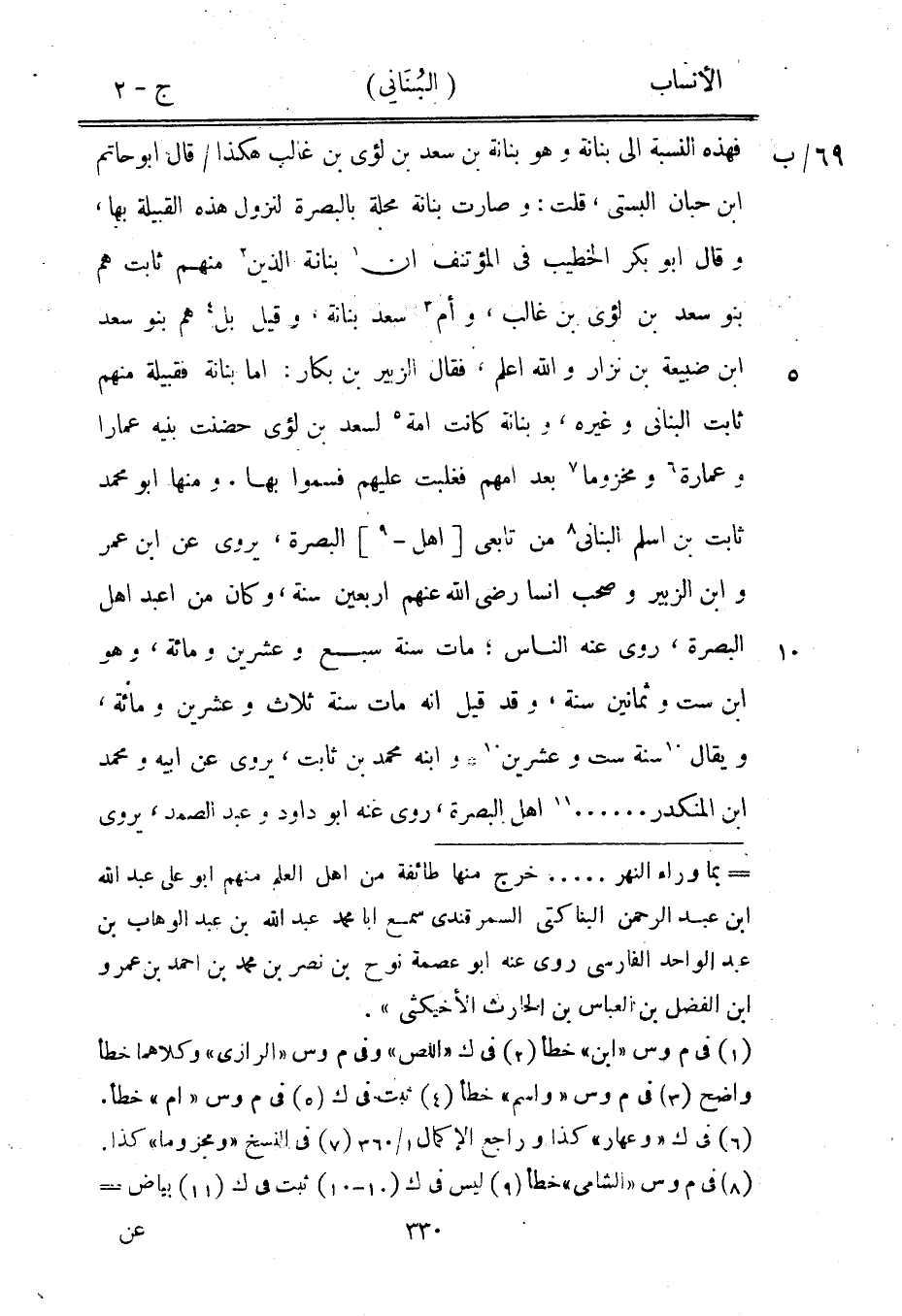 69/ ب فهذه النسبة الى بنانة وهو بنانة بن سعد بن لؤيّ بن غالب هكذا/ قال ابو حاتم ابن حبان البستي، قلت: وصارت بنانة محلة بالبصرة لنزول هذه القبيلة بها، وقال ابو بكر الخطيب في المؤتنف ان [1] بنانة الذين [2] منهم ثابت هم بنو سعد بن لؤيّ بن غالب، وأم [3] سعد بنانة، وقيل بل [4] هم بنو سعد ابن ضبيعة بن نزار والله اعلم، فقال الزبير بن بكار: اما بنانة فقبيلة منهم ثابت البناني وغيره، وبنانة كانت امة [5] لسعد بن لؤيّ حضنت بنيه عمارا وعمارة [6] ومخزوما [7] بعد أمهم فغلبت عليهم فسموا بها. ومنها ابو محمد ثابت بن أسلم البناني [8] من تابعي [أهل-[9]] البصرة، يروى عن ابن عمر وابن الزبير وصحب انسا رضى الله عنهم أربعين سنة، وكان من اعبد أهل البصرة، روى عنه الناس، مات سنة سبع وعشرين ومائة، وهو ابن ست وثمانين سنة، وقد قيل انه مات سنة ثلاث وعشرين ومائة، ويقال [10] سنة ست وعشرين [10] وابنه محمد بن ثابت، يروى عن أبيه ومحمد ابن المنكدر.... [11] أهل البصرة، روى عنه ابو داود وعبد الصمد، يروى
