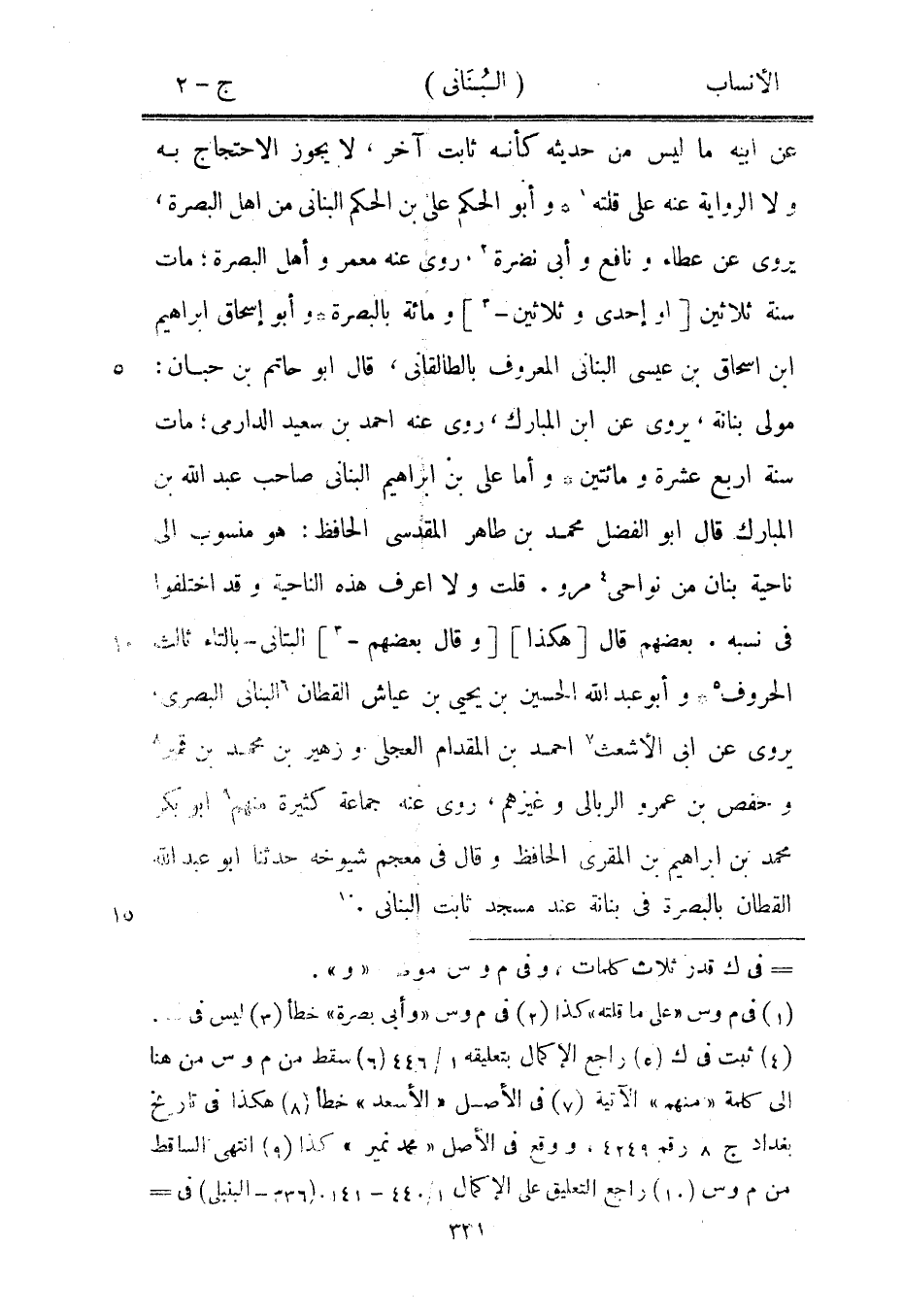 مولى بنانة، يروى عن ابن المبارك، روى عنه احمد بن سعيد الدارميّ، مات سنة اربع عشرة ومائتين وأما على بن إبراهيم البناني صاحب عبد الله بن المبارك قال ابو الفضل محمد بن طاهر المقدسي الحافظ: هو منسوب الى ناحية بنان من نواحي [4] مرو. قلت ولا اعرف هذه الناحية وقد اختلفوا في نسبه. بعضهم قال [هكذا] [وقال بعضهم-[3]] البتاني- بالتاء ثالث الحروف [5] وأبو عبد الله الحسين بن يحيى بن عياش القطان [6] البناني البصري، يروى عن ابى الأشعث [7] احمد بن المقدام العجليّ وزهير بن محمد بن قمير [8] وحفص بن عمرو الربالى وغيرهم، روى عنه جماعة كثيرة منهم [9] ابو بكر محمد بن إبراهيم بن المقري الحافظ وقال في معجم شيوخه حدثنا ابو عبد الله القطان بالبصرة في بنانة عند مسجد ثابت البناني. [10]