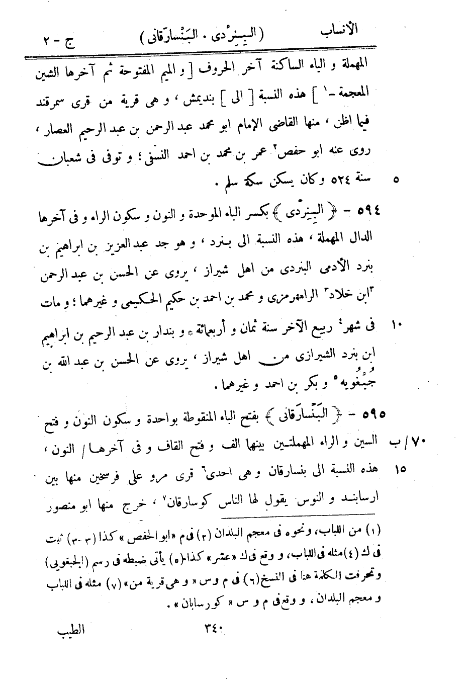 بفتح الباء المنقوطة بواحدة وسكون النون وفتح 70/ ب السين والراء المهملتين بينهما ألف وفتح القاف وفي آخرها/ النون، هذه النسبة الى بنسارقان وهي احدى [6] قرى مرو على فرسخين منها بين ارسابند والنوس يقول لها الناس كوسارقان [7] ، خرج منها ابو منصور