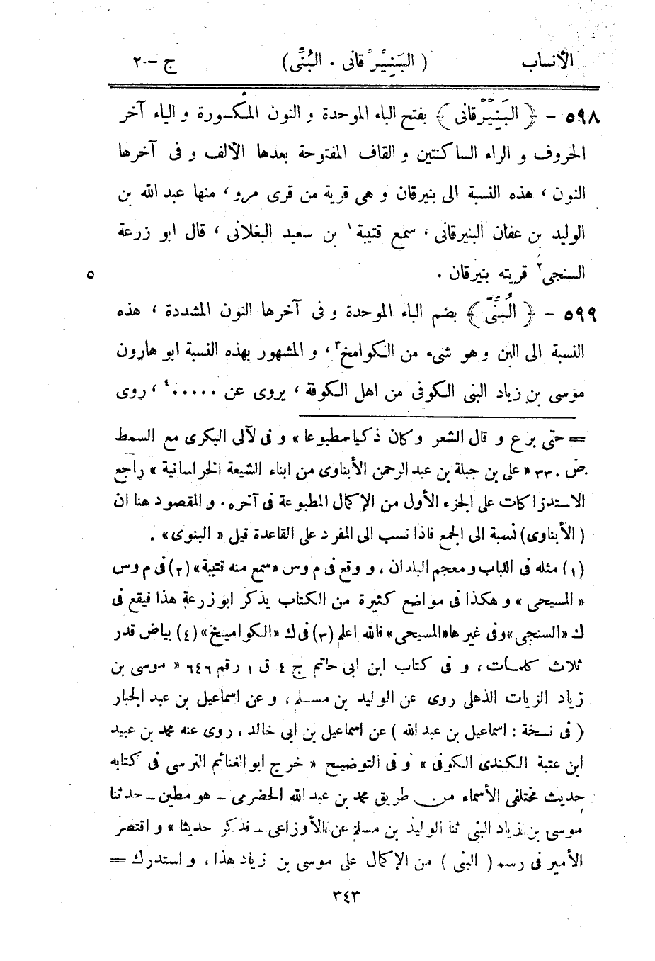 [ () ] حتى برع وقال الشعر وكان ذكيا مطبوعا» وفي لآلئ البكري مع السمط ص 330 «على بن جبلة بن عبد الرحمن الأبناوى من أبناء الشيعة الخراسانية» راجع الاستدراكات على الجزء الأول من الإكمال المطبوعة في آخره. والمقصود هنا ان (الأبناوى) نسبة الى الجمع فإذا نسب الى المفرد على القاعدة قيل «البنوى» .