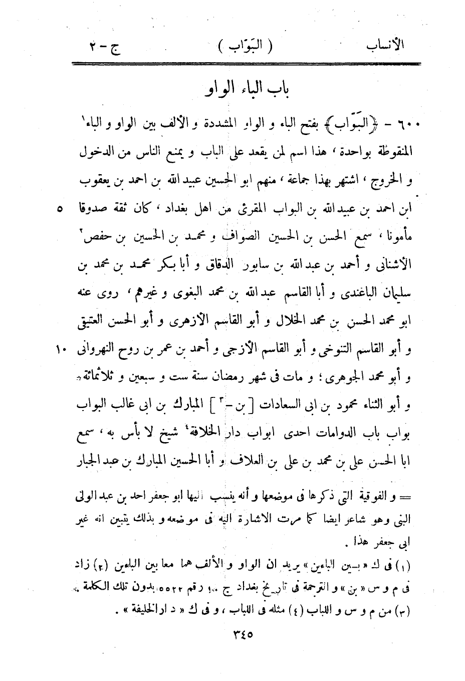 بفتح الباء والواو المشددة والألف بين الواو والباء [1] المنقوطة بواحدة، هذا اسم لمن يقعد على الباب ويمنع الناس من الدخول والخروج، اشتهر بهذا جماعة، منهم ابو الحسين عبيد الله بن احمد بن يعقوب ابن احمد بن عبيد الله بن البواب المقرئ من أهل بغداد، كان ثقة صدوقا مأمونا، سمع الحسن بن الحسين الصواف ومحمد بن الحسين بن حفص [2] الأشناني وأحمد بن عبد الله بن سابور الدقاق وأبا بكر محمد بن محمد بن سليمان الباغندي وأبا القاسم عبد الله بن محمد البغوي وغيرهم، روى عنه ابو محمد الحسن بن محمد الخلال وأبو القاسم الأزهري وأبو الحسن العتيقى وأبو القاسم التنوخي وأبو القاسم الأزجي وأحمد بن عمر بن روح النهرواني وأبو محمد الجوهري، ومات في شهر رمضان سنة ست وسبعين وثلاثمائة وأبو الثناء محمود بن ابى السعادات [بن-[3]] المبارك بن ابى غالب البواب بواب باب الدوامات احدى أبواب دار الخلافة [4] شيخ لا بأس به، سمع ابا الحسن على بن محمد بن على بن العلاف وأبا الحسين المبارك بن عبد الجبار
