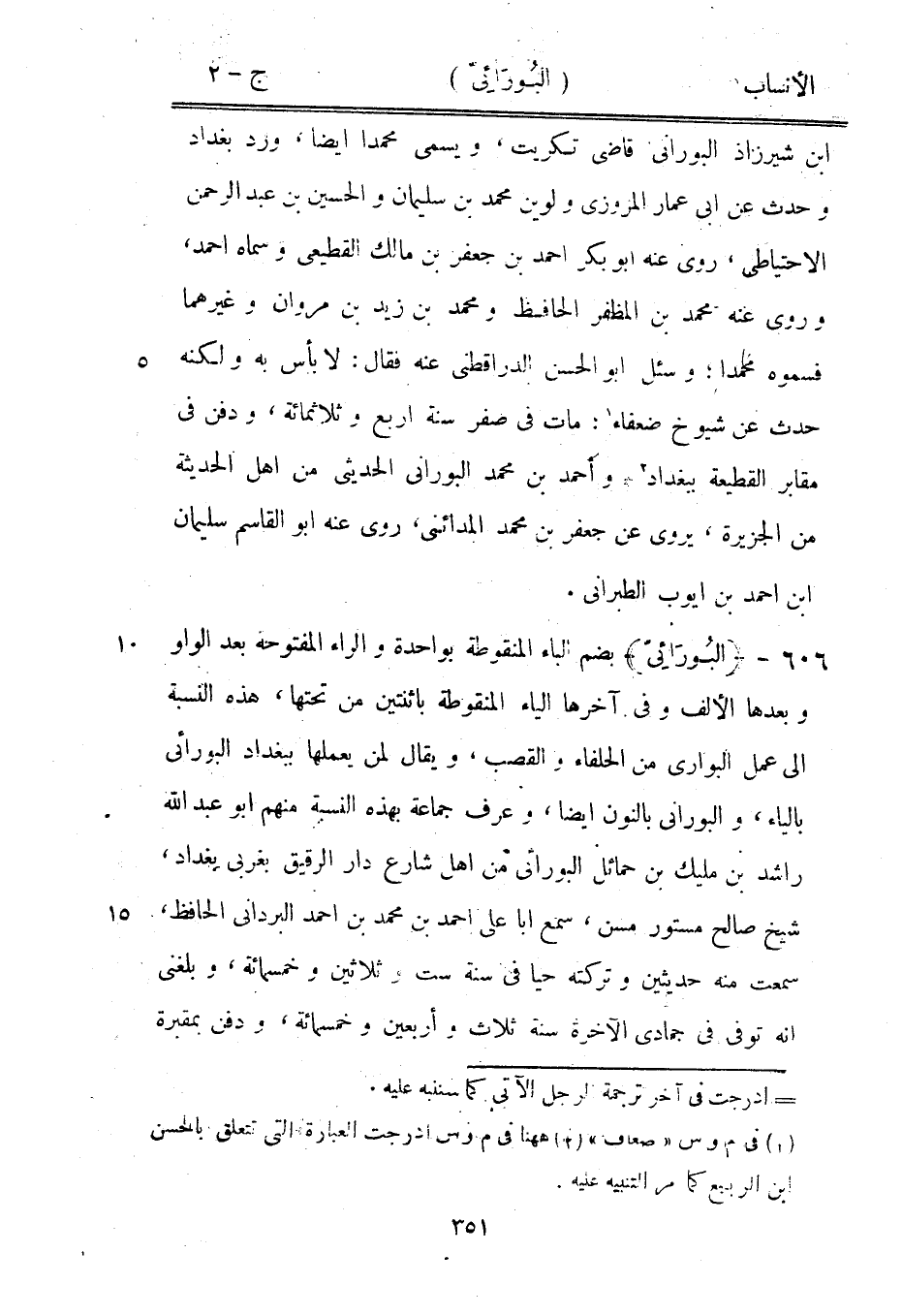 ابن شيرزاذ البوراني قاضى تكريت، ويسمى محمدا أيضا، ورد بغداد وحدث عن ابى عمار المروزي ولوين محمد بن سليمان والحسين بن عبد الرحمن الاحتياطى، روى عنه ابو بكر احمد بن جعفر بن مالك القطيعي وسماه احمد، وروى عنه محمد بن المظفر الحافظ ومحمد بن زيد بن مروان وغيرهما فسموه محمدا، وسئل ابو الحسن الدارقطنيّ عنه فقال: لا بأس به ولكنه حدث عن شيوخ ضعفاء [1] ، مات في صفر سنة اربع وثلاثمائة، ودفن في مقابر القطيعة ببغداد [2] وأحمد بن محمد البوراني الحديثى من أهل الحديثة من الجزيرة، يروى عن جعفر بن محمد المدائني، روى عنه ابو القاسم سليمان ابن احمد بن أيوب الطبراني.