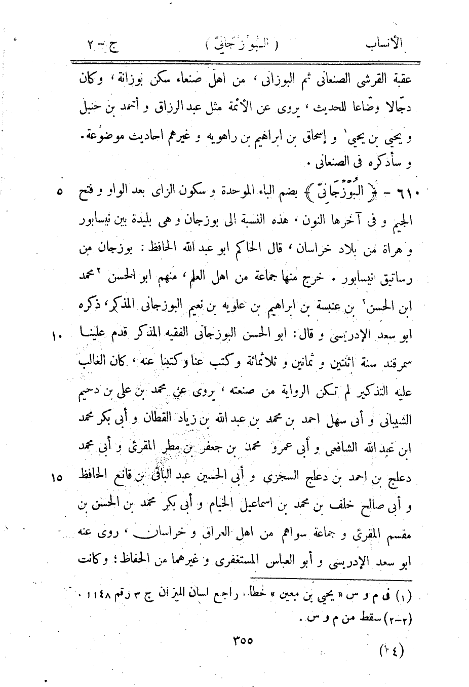 بضم الباء الموحدة وسكون الزاى بعد الواو وفتح الجيم وفي آخرها النون، هذه النسبة الى بوزجان وهي بليدة بين نيسابور وهراة من بلاد خراسان، قال الحاكم ابو عبد الله الحافظ: بوزجان من رساتيق نيسابور. خرج منها جماعة من أهل العلم، منهم ابو الحسن [2] محمد ابن الحسن [2] بن عنبسة بن إبراهيم بن علوية بن نعيم البوزجاني المذكر، ذكره ابو سعد الإدريسي وقال: ابو الحسن البوزجاني الفقيه المذكر قدم علينا سمرقند سنة اثنتين وثمانين وثلاثمائة وكتب عنا وكتبنا عنه، كان الغالب عليه التذكير لم تكن الرواية من صنعته، يروى عن محمد بن على بن دحيم الشيباني وأبى سهل احمد بن محمد بن عبد الله بن زياد القطان وأبى بكر محمد ابن عبد الله الشافعيّ وأبى عمرو محمد بن جعفر بن مطر المقرئ وأبى محمد دعلج بن احمد بن دعلج السجزى وأبى الحسين عبد الباقي بن قانع الحافظ وأبى صالح خلف بن محمد بن إسماعيل الخيام وأبى بكر محمد بن الحسن بن مقسم المقرئ وجماعة سواهم من أهل العراق وخراسان، روى عنه ابو سعد الإدريسي وأبو العباس المستغفري وغيرهما من الحفاظ، وكانت