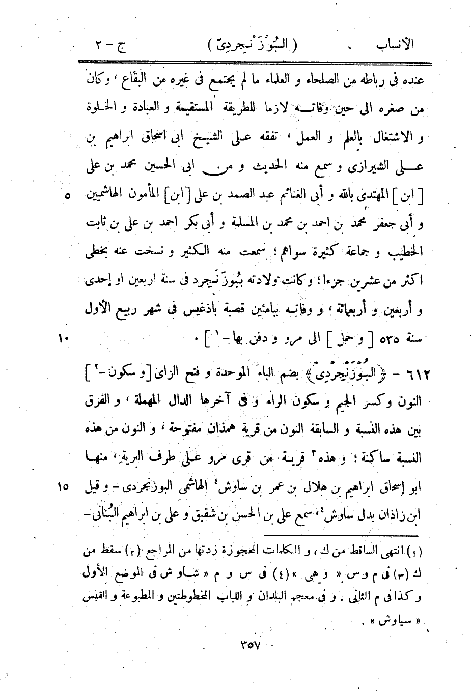 بضم الباء الموحدة وفتح الزاى [وسكون-[2]] النون وكسر الجيم وسكون الراء وفي آخرها الدال المهملة، والفرق بين هذه النسبة والسابقة النون من قرية همذان مفتوحة، والنون من هذه النسبة ساكنة، وهذه [3] قرية من قرى مرو على طرف البرية، منها ابو إسحاق إبراهيم بن هلال بن عمر بن ساوش [4] الهاشمي البوزنجردى- وقيل ابن زاذان بدل ساوش [4] ، سمع على بن الحسن بن شقيق وعلى بن إبراهيم البناني-