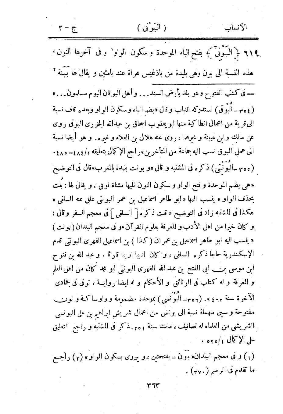 وكان خيرا من أهل الأدب والمعرفة بعلوم القرآن» وفي معجم البلدان (بونت) «ينسب اليه ابو طاهر إسماعيل بن عمران (كذا) بن إسماعيل الفهري البونتي قدم الإسكندرية حاجا ذكره السلفي، وكان أديبا أريبا قارئا. وعبد الله بن فتوح ابن موسى بن ابى الفتح بن عبد الله الفهري البونتي ابو محمد كان من أهل العلم والمعرفة وله كتاب في الوثائق والأحكام وله أيضا رواية، توفى في جمادى الآخرة سنة 462» . (356- البونسي) بموحدة مضمومة وواو ساكنة ونون مفتوحة وسين مهملة نسبة الى بونس من اعمال شريش إبراهيم بن على البونسي الشريشى من العلماء له تصانيف، مات سنة 251. ذكر في المشتبه وراجع التعليق على الإكمال 1/ 525.