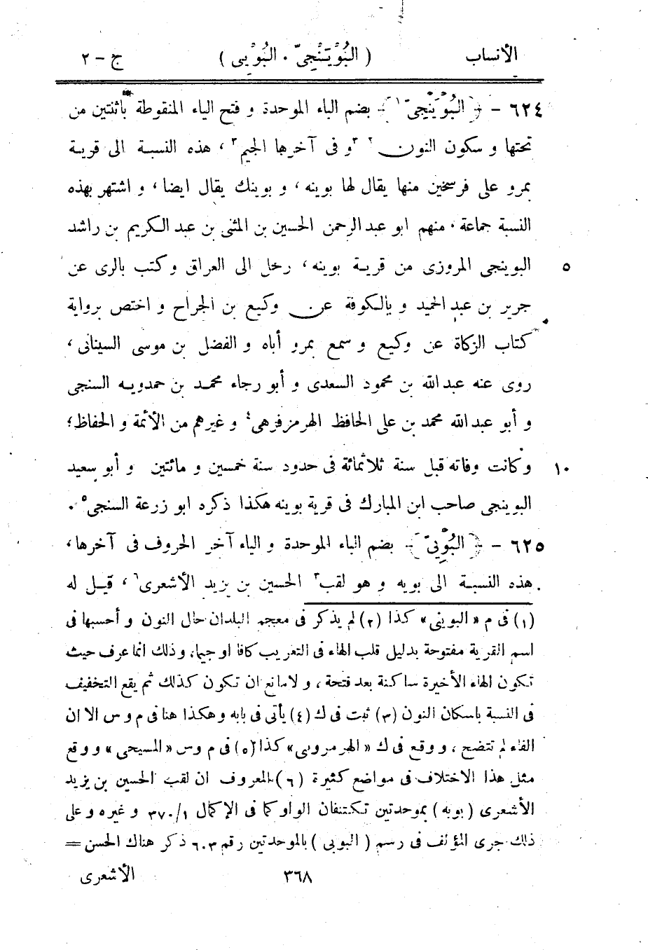 [1] بضم الباء الموحدة وفتح الياء المنقوطة باثنتين من تحتها وسكون النون [2] [3] وفي آخرها الجيم [3] ، هذه النسبة الى قرية بمرو على فرسخين منها يقال لها بوينه، وبوينك يقال أيضا، واشتهر بهذه النسبة جماعة، منهم ابو عبد الرحمن الحسين بن المثنى بن عبد الكريم بن راشد البوينجى المروزي من قرية بوينه، رحل الى العراق وكتب بالري عن جرير بن عبد الحميد وبالكوفة عن وكيع بن الجراح واختص برواية كتاب الزكاة عن وكيع وسمع بمرو أباه والفضل بن موسى السينانى، روى عنه عبد الله بن محمود السعدي وأبو رجاء محمد بن حمدويه السنجى وأبو عبد الله محمد بن على الحافظ الهرمزفرهى [4] وغيرهم من الأئمة والحفاظ، وكانت وفاته قبل سنة ثلاثمائة في حدود سنة خمسين ومائتين وأبو سعيد البوينجى صاحب ابن المبارك في قرية بوينه هكذا ذكره ابو زرعة السنجى [5] .