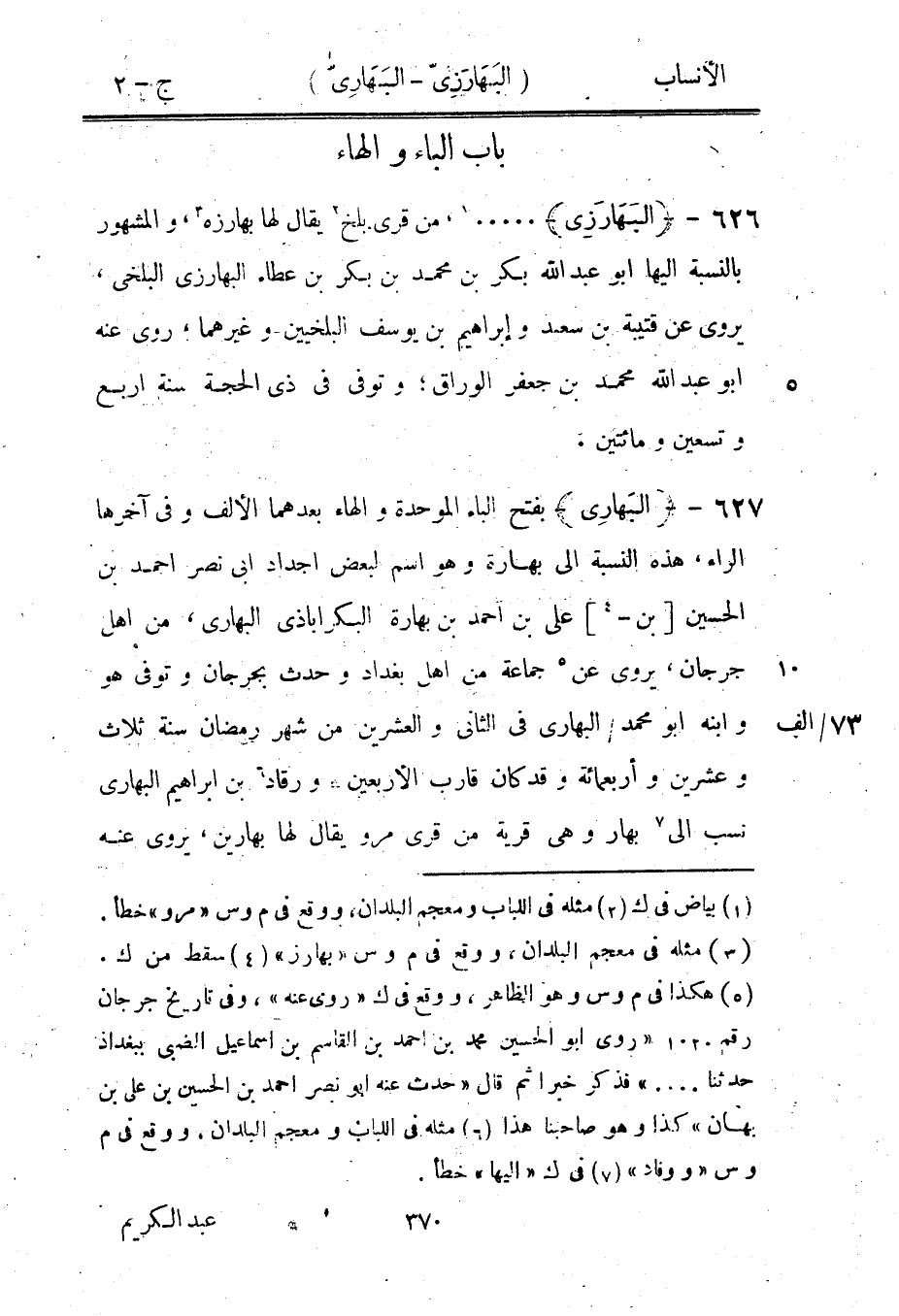 بفتح الباء الموحدة والهاء بعدهما الألف وفي آخرها الراء، هذه النسبة الى بهارة وهو اسم لبعض أجداد ابى نصر احمد بن الحسين [بن-[4]] على بن احمد بن بهارة البكراباذي البهاري، من أهل جرجان، يروى عن [5] جماعة من أهل بغداد وحدث بجرجان وتوفى هو 73/ ألف وابنه ابو محمد/ البهاري في الثاني والعشرين من شهر رمضان سنة ثلاث وعشرين وأربعمائة وقد كان قارب الأربعين ورقاد [6] بن إبراهيم البهاري نسب الى [7] بهار وهي قرية من قرى مرو يقال لها بهارين، يروى عنه