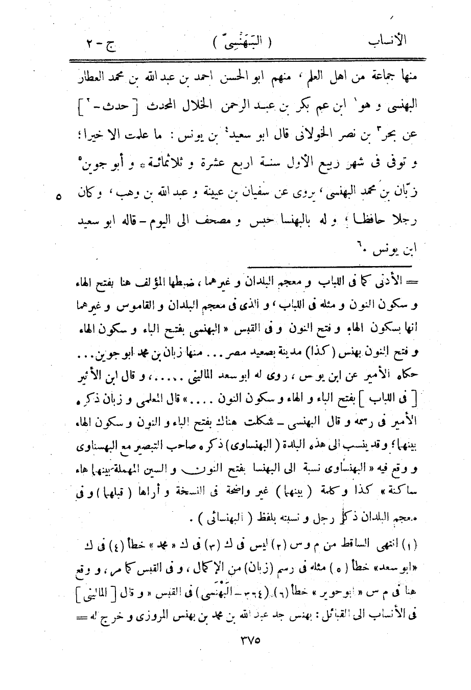حكاه الأمير عن ابن يونس، روى له ابو سعد الماليني ... ، وقال ابن الأثير [في اللباب] بفتح الباء والهاء وسكون النون ... » قال المعلمي وزبان ذكره الأمير في رسمه وقال البهنسي- شكلت هناك بفتح الباء والنون وسكون الهاء بينهما، وقد ينسب الى هذه البلدة (البهنساوى) ذكره صاحب التبصير مع البهسناوي ووقع فيه «البهنساوى نسبة الى البهنسا بفتح النون والسين المهملة بينهما هاء ساكنة» كذا وكلمة (بينهما) غير واضحة في النسخة وأراها (قبلهما) وفي معجم البلدان ذكر رجل ونسبته بلفظ (البهنسائى) .