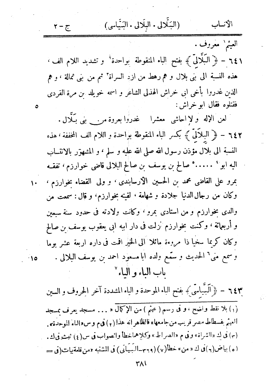 بكسر الباء المنقوطة بواحدة واللام ألف المخففة، هذه النسبة الى بلال مؤذن رسول الله صلى الله عليه وسلم، والمشهور بالانتساب اليه ابو [4] .... [5] صالح بن يوسف بن صالح البلالي قاضى خوارزم، تفقه بمرو على القاضي محمد بن الحسين الأرسابندي، وولى القضاء بخوارزم، وكان من رجال الدنيا جلادة وشهامة، لقيته بخوارزم، وقال: سمعت من والدي بخوارزم ومن استادى بمرو، وكانت ولادته في حدود سنة سبعين وأربعمائة، وكنت بخوارزم نزلت في دار أبيه ابى يعقوب يوسف بن صالح وكان كريما سخيا ذا مروءة مائلا الى الخير أقمت في داره اربعة عشر يوما وسمع منى [6] الحديث وسمّع ولده ابا مسعود احمد بن يوسف البلالي.