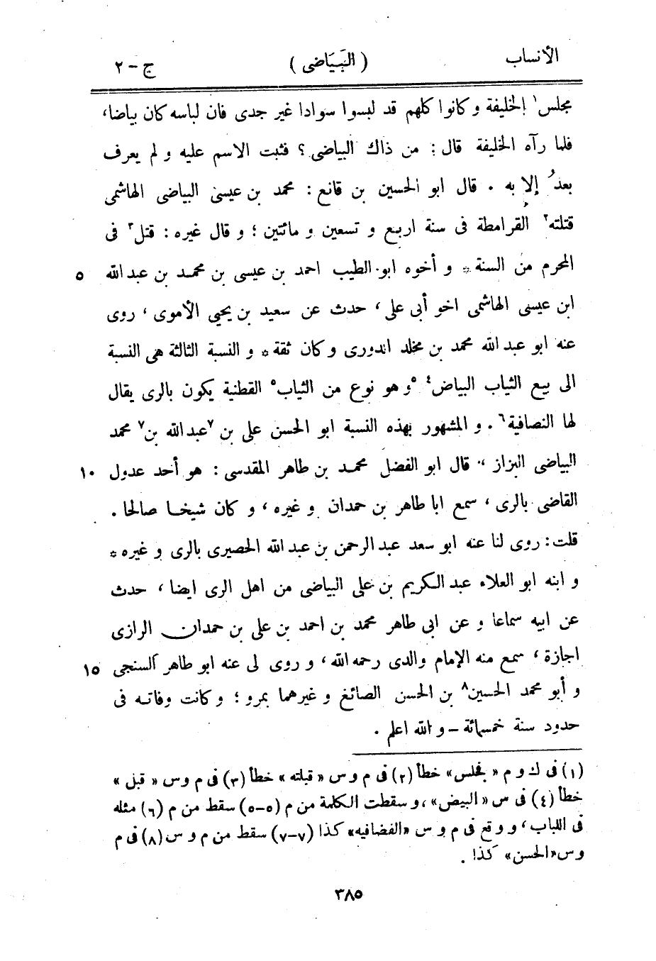 مجلس [1] الخليفة وكانوا كلهم قد لبسوا سوادا غير جدي فان لباسه كان بياضا، فلما رآه الخليفة قال: من ذاك البياضي؟ فثبت الاسم عليه ولم يعرف بعد إلا به. قال ابو الحسين بن قانع: محمد بن عيسى البياضي الهاشمي قتلته [2] القرامطة في سنة اربع وتسعين ومائتين، وقال غيره: قتل [3] في المحرم من السنة وأخوه ابو الطيب احمد بن عيسى بن محمد بن عبد الله ابن عيسى الهاشمي أخو أبى على، حدث عن سعيد بن يحيى الأموي، روى عنه ابو عبد الله محمد بن مخلد الدوري وكان ثقة والنسبة الثالثة هي النسبة الى بيع الثياب البياض [4] [5] وهو نوع من الثياب [5] القطنية يكون بالري يقال لها النصافية [6] . والمشهور بهذه النسبة ابو الحسن على بن [7] عبد الله بن [7] محمد البياضي البزاز، قال ابو الفضل محمد بن طاهر المقدسي: هو أحد عدول القاضي بالري، سمع ابا طاهر بن حمدان وغيره، وكان شيخا صالحا.