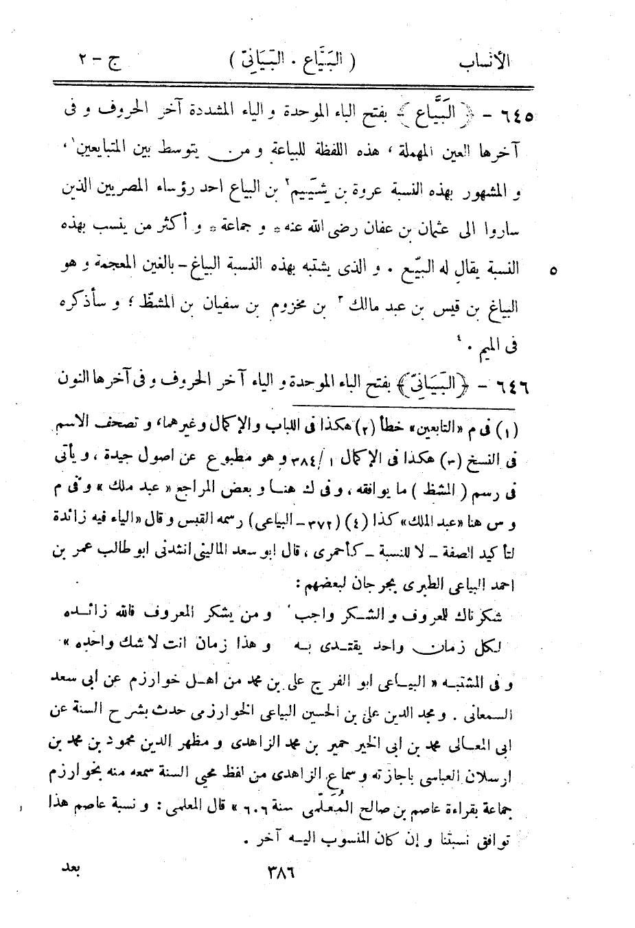 [4] (372- البياعى) رسمه القبس وقال «الياء فيه زائدة لتأكيد الصفة- لا للنسبة- كأحمرى، قال ابو سعد الماليني انشدنى ابو طالب عمر بن احمد البياعى الطبري بجرجان لبعضهم: