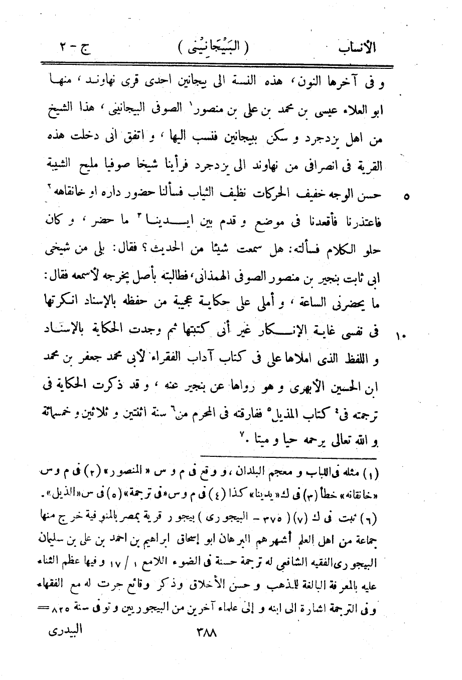 [7] (375- البيجوري) بيجور قرية بمصر بالمنوفية خرج منها جماعة من أهل العلم أشهرهم البرهان ابو إسحاق إبراهيم بن احمد بن على بن سليمان البيجوري الفقيه الشافعيّ له ترجمة حسنة في الضوء اللامع 1/ 17 وفيها عظم الثناء عليه بالمعرفة البالغة للمذهب وحسن الأخلاق وذكر وقائع جرت له مع الفقهاء وفي الترجمة اشارة الى ابنه وإلى علماء آخرين من البيجوريين وتوفى سنة 825-