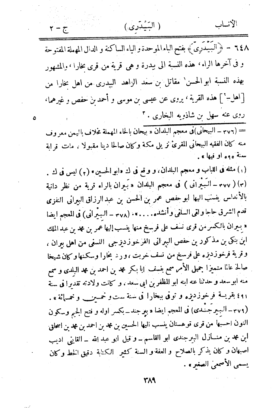 [3] (377- البيرانى) في معجم البلدان «بيران بالراء قرية من نظر دانية بالأندلس ينسب اليها ابو حفص عمر بن الحسن بن عبد الرزاق البيرانى النفزى قدم الشرقي حاجا ولقي السلفي وأنشده ... » . (378- البيرانى) في المعجم أيضا «بيران بالكسر من قرى نسف على فرسخ منها ينسب إليها عمر بن محمد بن عبد الملك ابن بنكى بن مذكور بن حفص البيرانى الفرخوزديزجى النسفي من أهل بيران، وقرية فرخوزديزه على فرسخ من نسف خربت، ورد بخارا وسكنها وكان شيخا صالحا عالما متميزا جميل الأمر سمع بنسف ابا بكر محمد بن احمد بن محمد البلدي وسمع منه ابو سعد وحدثنا عنه ابنه ابو المظفر بن ابى سعد، وكانت ولادته تقديرا في سنة 491 بقرية فرخوزديزه وتوفى ببخارا في سنة ست وخمسين وخمسمائة» .