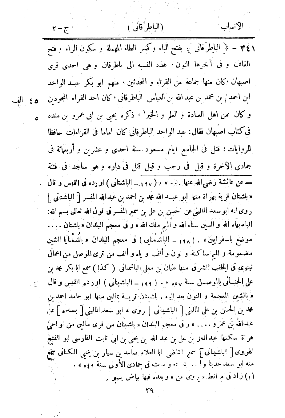 [ () ] عن عائشة رضى الله عنها ... » . (197- الباشتانى) أورده في القبس وقال «باشتان قرية بهراة منها ابو عبد الله محمد بن احمد بن عبد الله المفسر [الباشتانى] روى له ابو سعد الماليني عن الحسن بن على بن سمير المفسر في قول الله تعالى بسم الله: