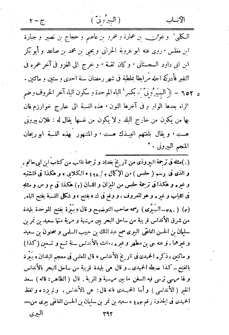 [3] (380- البيري) رسمه صاحب التوضيح وقال «بيرة بفتح الموحدة بليدة من شرق الأندلس قريبة من ساحل البحر بين مرسية ومرية منها سعيد بن نمر بن سليمان بن الحسن الغافقي البيري سمع عبد الملك بن حبيب السلمي وسحنون بن سعيد وغيرهما، وعنه حي بن مطهر وغيره، مات بالأندلس سنة تسع وتسعين (كذا) ومائتين، ذكره الحميدي في تاريخ الأندلس» قال المعلمي في معجم البلدان «بيرة بالفتح- كذا ضبطه الحميدي- وقال هي بليدة قريبة من ساحل البحر بالأندلس ولها مرسى ترسى فيه السفن ما بين مرسية والمرية. قال (الظاهر: قاله) سعد الخير (الأندلسى) وأما الحميدي فإنه قال: هي بالأندلس، ولم يزد» ولفظ الحميدي في الجذوة رقم 483 «سعيد بن نمر بن سليمان بن الحسن الغافقي بيرى من-