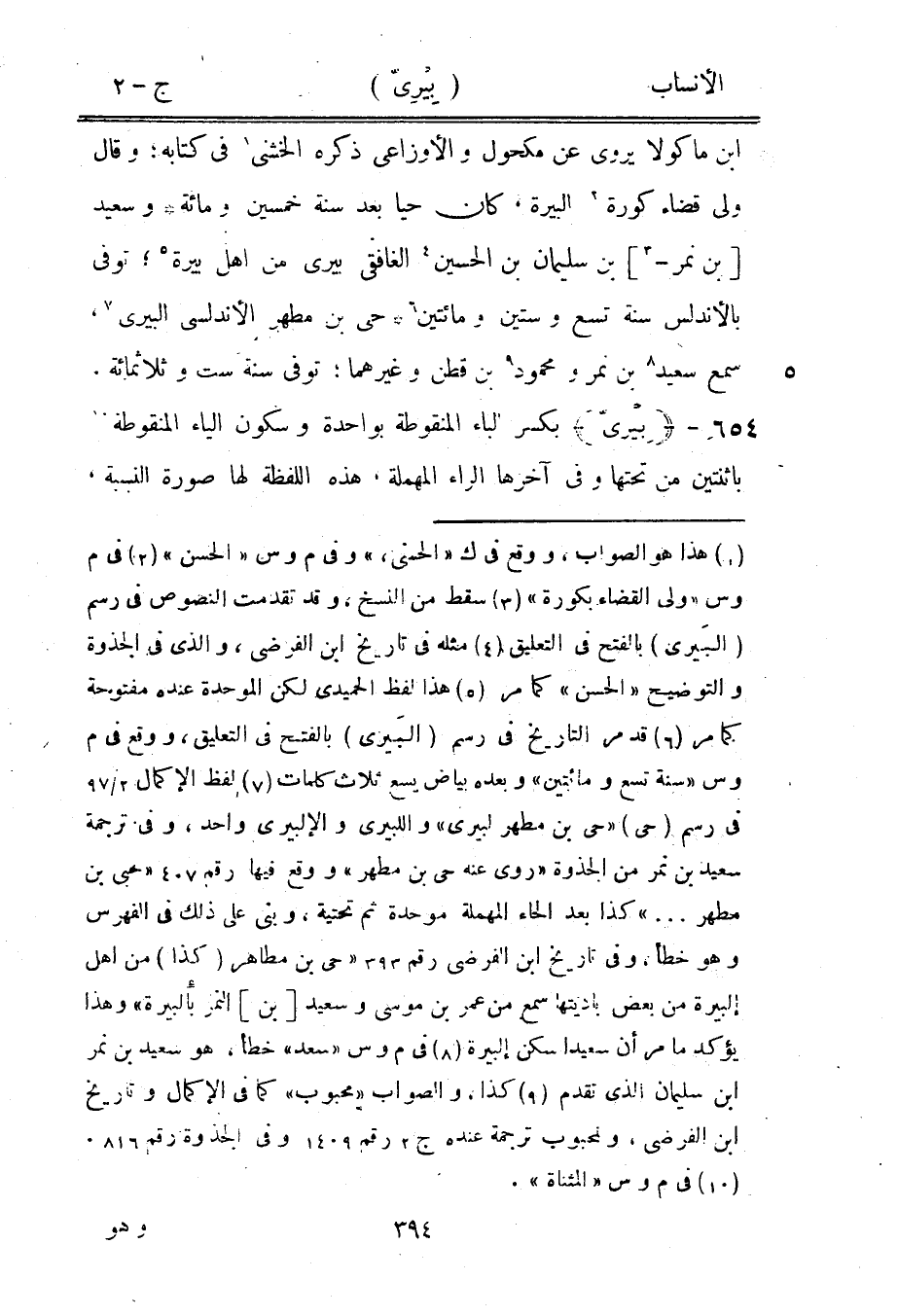 ابن ماكولا يروى عن مكحول والأوزاعي ذكره الخشنيّ [1] في كتابه، وقال ولى قضاء كورة [2] البيرة، كان حيا بعد سنة خمسين ومائة وسعيد [بن نمر-[3]] بن سليمان بن الحسين [4] الغافقي بيرى من أهل بيرة [5] ، توفى بالأندلس سنة تسع وستين ومائتين [6] حي بن مطهر الأندلسى البيري [7] ، سمع سعيد [8] بن نمر ومحمود [9] بن قطن وغيرهما، توفى سنة ست وثلاثمائة.