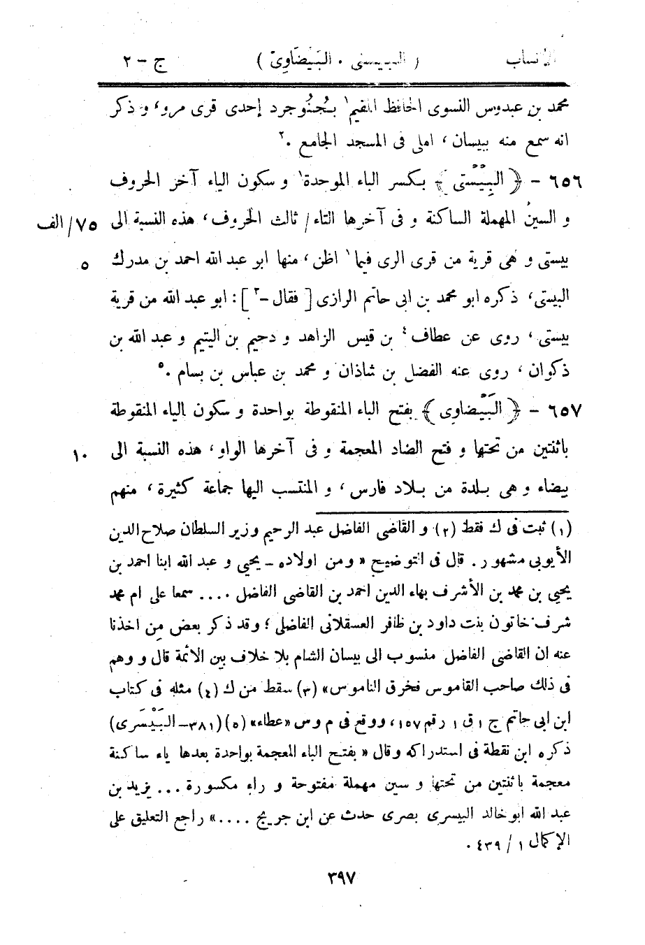 [5] (381- البيسري) ذكره ابن نقطة في استدراكه وقال «بفتح الباء المعجمة بواحدة بعدها ياء ساكنة معجمة باثنتين من تحتها وسين مهملة مفتوحة وراء مكسورة ... يزيد بن عبد الله ابو خالد البيسري بصرى حدث عن ابن جريج ... » راجع التعليق على الإكمال 1/ 439.
