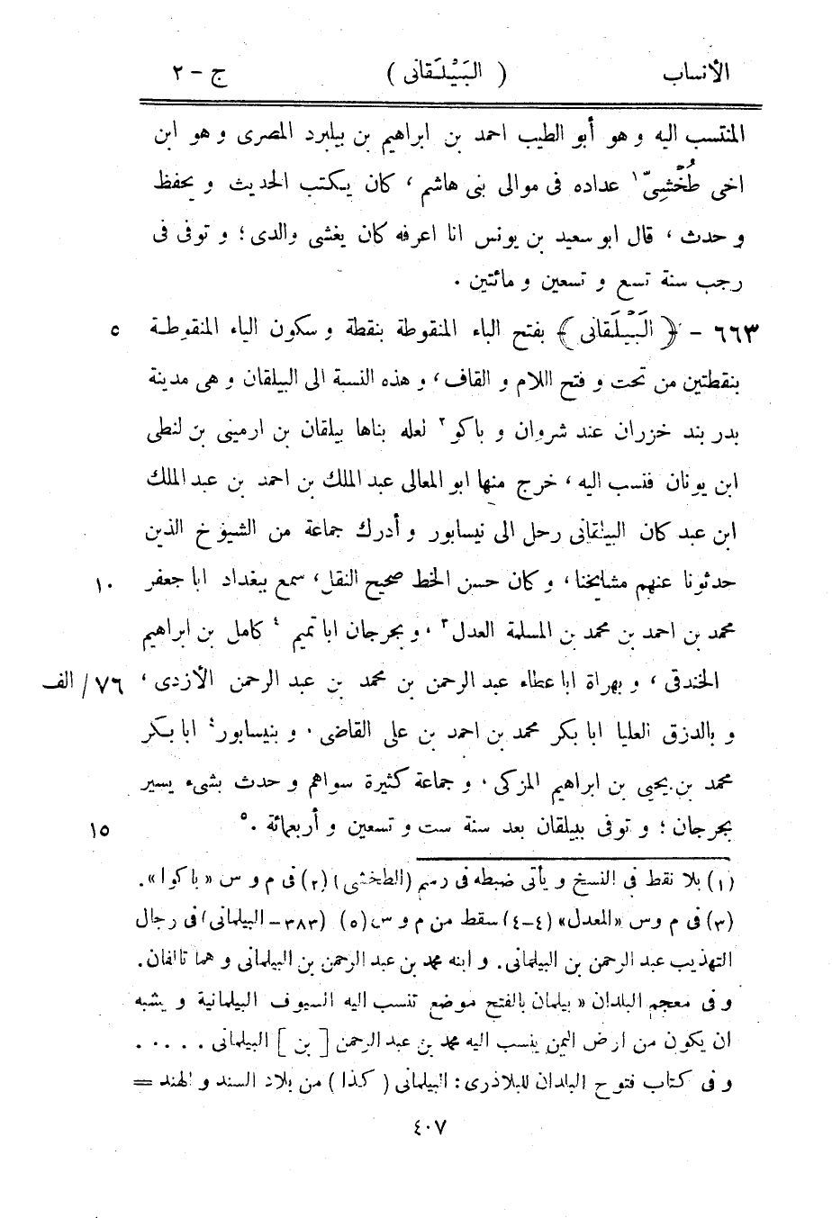 بفتح الباء المنقوطة بنقطة وسكون الياء المنقوطة بنقطتين من تحت وفتح اللام والقاف، وهذه النسبة الى البيلقان وهي مدينة بدر بند خزران عند شروان وباكو [2] لعله بناها بيلقان بن ارمينى بن لنطى ابن يونان فنسب اليه، خرج منها ابو المعالي عبد الملك بن احمد بن عبد الملك ابن عبدكان البيلقاني رحل الى نيسابور وأدرك جماعة من الشيوخ الذين حدثونا عنهم مشايخنا، وكان حسن الخط صحيح النقل، سمع ببغداد ابا جعفر محمد بن احمد بن محمد بن المسلمة العدل [3] ، وبجرجان ابا تميم [4] كامل بن إبراهيم الخندقي، وبهراة ابا عطاء عبد الرحمن بن محمد بن عبد الرحمن الأزدي، 76/ ألف وبالدزق العليا ابا بكر محمد بن احمد بن على القاضي، وبنيسابور [4] ابا بكر محمد بن يحيى بن إبراهيم المزكي، وجماعة كثيرة سواهم وحدث بشيء يسير بجرجان، وتوفى ببيلقان بعد سنة ست وتسعين وأربعمائة. [5]