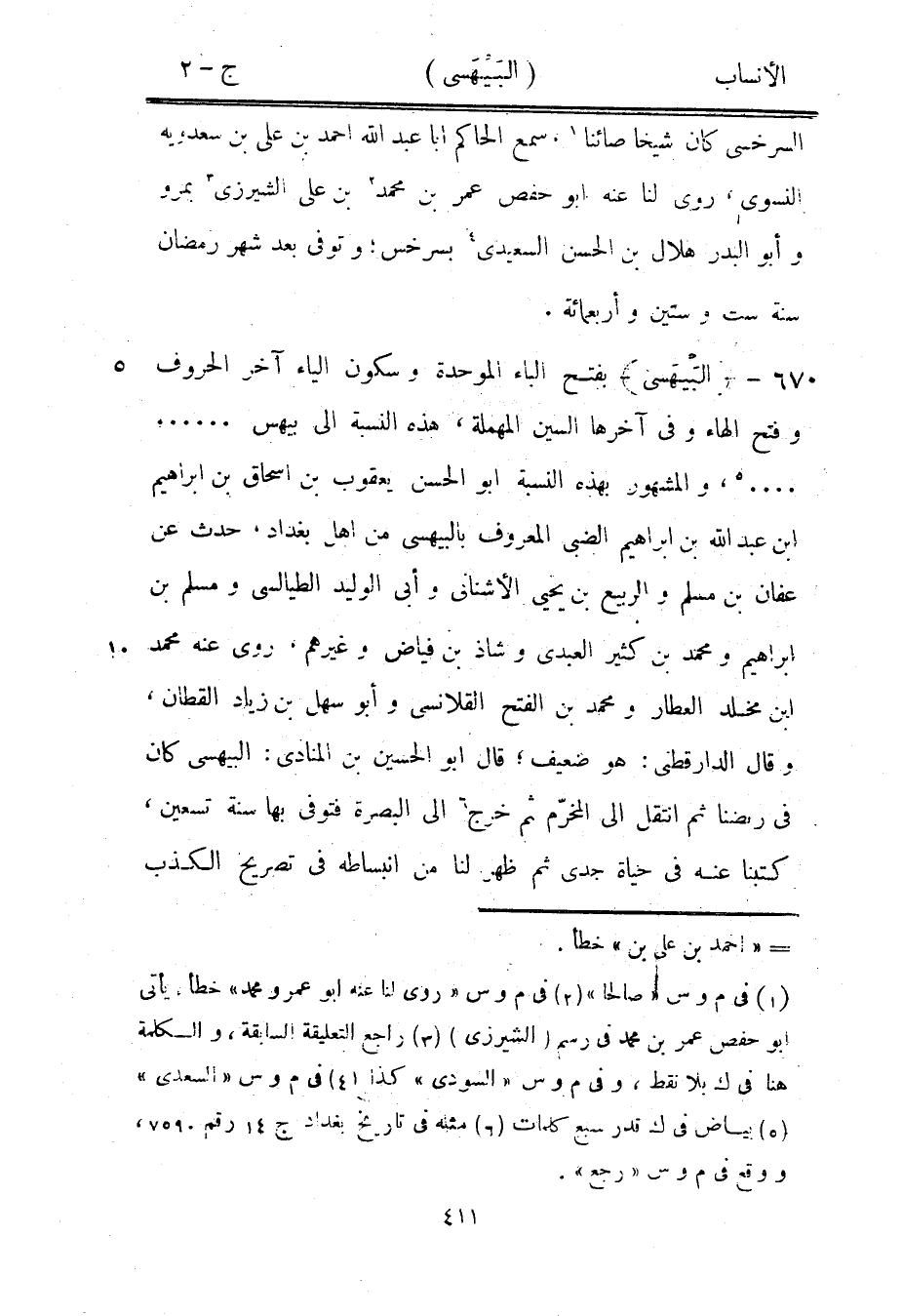 ... [5] ، والمشهور بهذه النسبة ابو الحسن يعقوب بن إسحاق بن إبراهيم ابن عبد الله بن إبراهيم الضبيّ المعروف بالبيهسي من أهل بغداد، حدث عن عفان بن مسلم والربيع بن يحيى الأشناني وأبى الوليد الطيالسي ومسلم بن إبراهيم ومحمد بن كثير العبديّ وشاذ بن فياض وغيرهم، روى عنه محمد ابن مخلد العطار ومحمد بن الفتح القلانسي وأبو سهل بن زياد القطان، وقال الدارقطنيّ: هو ضعيف، قال ابو الحسين بن المنادي: البيهسي كان في ربضنا ثم انتقل الى المخرّم ثم خرج [6] الى البصرة فتوفى بها سنة تسعين، كتبنا عنه في حياة جدي ثم ظهر لنا من انبساطه في تصريح الكذب