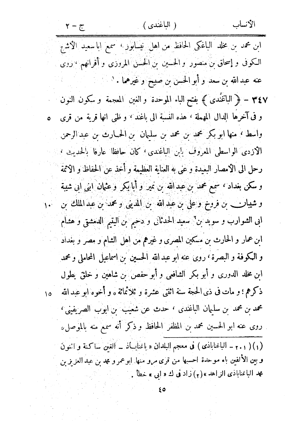 بفتح الباء الموحدة والغين المعجمة وسكون النون وفي آخرها الدال المهملة، هذه النسبة الى باغند، وظني انها قرية من قرى واسط، منها ابو بكر محمد بن محمد بن سليمان بن الحارث بن عبد الرحمن الأزدي الواسطي المعروف بابن الباغندي، كان حافظا عارفا بالحديث، رحل الى الأمصار البعيدة وعنى به العناية العظيمة وأخذ عن الحفاظ والأئمة وسكن بغداد، سمع محمد بن عبد الله بن نمير وأبا بكر وعثمان ابني ابى شيبة وشيبان بن فروخ وعلى بن عبد الله بن المديني ومحمد بن عبد الملك بن ابى الشوارب وسويد بن [2] سعيد الحدثانى ودحيم بن اليتيم الدمشقيّ وهشام ابن عمار والحارث بن مسكين المصري وغيرهم من أهل الشام ومصر وبغداد والكوفة والبصرة، روى عنه ابو عبد الله الحسين بن إسماعيل المحاملي ومحمد ابن مخلد الدوري وأبو بكر الشافعيّ وأبو حفص بن شاهين وخلق يطول ذكرهم، ومات في ذي الحجة سنة اثنتي عشرة وثلاثمائة وأخوه ابو عبد الله محمد بن محمد بن سليمان الباغندي، حدث عن شعيب بن أيوب الصريفيني، روى عنه ابو الحسين محمد بن المظفر الحافظ وذكر أنه سمع منه بالموصل
