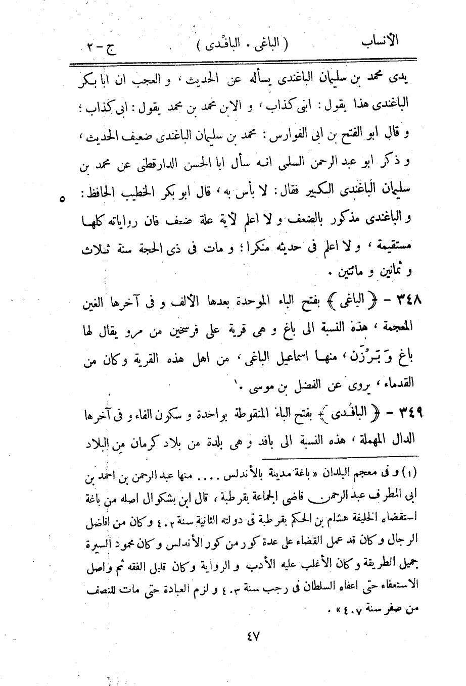 والباغندي مذكور بالضعف ولا اعلم لأية علة ضعف فان رواياته كلها مستقيمة، ولا اعلم في حديثه منكرا، ومات في ذي الحجة سنة ثلاث وثمانين ومائتين.