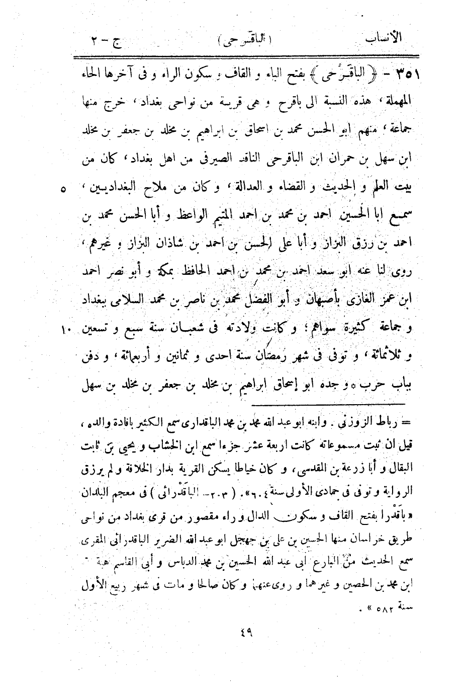 [ (-) ] رباط الزوزنى. وابنه ابو عبد الله محمد بن محمد الباقداري سمع الكثير بإفادة والده، قيل ان ثبت مسموعاته كانت اربعة عشر جزءا سمع ابن الخشاب ويحيى بن ثابت البقال وأبا زرعة بن المقدسي، وكان خياطا يسكن القرية بدار الخلافة ولم يرزق الرواية وتوفى في جمادى الأولى سنة 604» . (203- الباقدرائى) في معجم البلدان «باقدرا بفتح القاف وسكون الدال وراء مقصور من قرى بغداد من نواحي طريق خراسان منها الحسين بن على بن جهجل ابو عبد الله الضرير الباقدرائى المقري سمع الحديث من البارع ابى عبد الله الحسين بن محمد الدباس وأبى القاسم هبة الله ابن محمد بن الحصين وغيرهما وروى عنهما وكان صالحا ومات في شهر ربيع الأول سنة 582» .