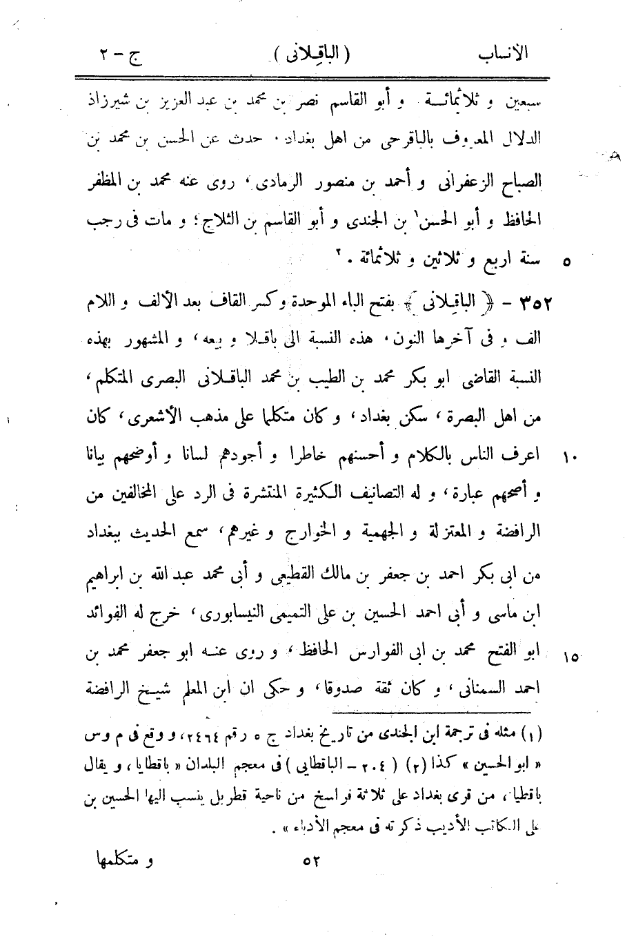 بفتح الباء الموحدة وكسر القاف بعد الألف واللام ألف وفي آخرها النون، هذه النسبة الى باقلاء وبيعه، والمشهور بهذه النسبة القاضي ابو بكر محمد بن الطيب بن محمد الباقلاني البصري المتكلم، من أهل البصرة، سكن بغداد، وكان متكلما على مذهب الأشعري، كان اعرف الناس بالكلام وأحسنهم خاطرا وأجودهم لسانا وأوضحهم بيانا وأصحهم عبارة، وله التصانيف الكثيرة المنتشرة في الرد على المخالفين من الرافضة والمعتزلة والجهمية والخوارج وغيرهم، سمع الحديث ببغداد من ابى بكر احمد بن جعفر بن مالك القطيعي وأبى محمد عبد الله بن إبراهيم ابن ماسى وأبى احمد الحسين بن على التميمي النيسابورىّ، خرج له الفوائد ابو الفتح محمد بن ابى الفوارس الحافظ، وروى عنه ابو جعفر محمد بن احمد السمناني، وكان ثقة صدوقا، وحكى ان ابن المعلم شيخ الرافضة