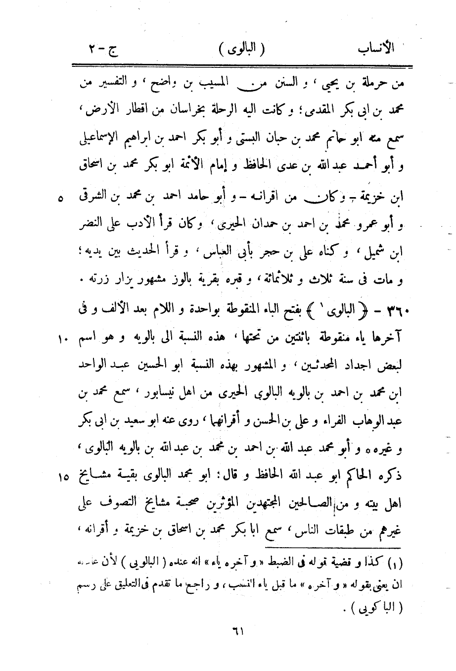 [1] بفتح الباء المنقوطة بواحدة واللام بعد الألف وفي آخرها ياء منقوطة باثنتين من تحتها، هذه النسبة الى بالويه وهو اسم لبعض أجداد المحدثين، والمشهور بهذه النسبة ابو الحسين عبد الواحد ابن محمد بن احمد بن بالويه البالوي الحيريّ من أهل نيسابور، سمع محمد بن عبد الوهاب الفراء وعلى بن الحسن وأقرانهما، روى عنه ابو سعيد بن ابى بكر وغيره وأبو محمد عبد الله بن احمد بن محمد بن عبد الله بن بالويه البالوي، ذكره الحاكم ابو عبد الله الحافظ وقال: ابو محمد البالوي بقية مشايخ أهل بيته ومن الصالحين المجتهدين المؤثرين صحبة مشايخ التصوف على غيرهم من طبقات الناس، سمع ابا بكر محمد بن إسحاق بن خزيمة وأقرانه،