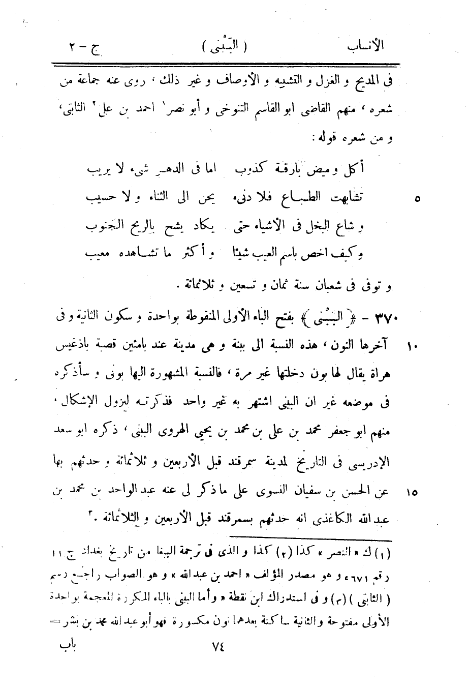 [3] وفي استدراك ابن نقطة «وأما الببنى بالباء المكررة المعجمة بواحدة الأولى مفتوحة والثانية ساكنة بعدهما نون مكسورة فهو أبو عبد الله محمد بن بشر-