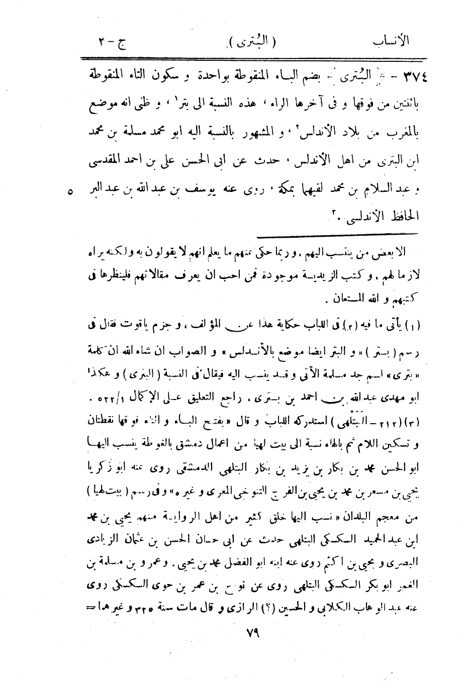 [3] (212- البَتَلهى) استدركه اللباب وقال «بفتح الباء والتاء فوقها نقطتان وتسكين اللام ثم بالهاء نسبة الى بيت لهيا من اعمال دمشق بالغوطة ينسب اليها ابو الحسن محمد بن بكار بن يزيد بن بكار البتلهي الدمشقيّ روى عنه ابو زكريا يحيى بن مسعر بن محمد بن يحيى بن الفرج التنوخي المعرى وغيره» وفي رسم (بيت لهيا) من معجم البلدان «نسب اليها خلق كثير من أهل الرواية منهم يحيى بن محمد ابن عبد الحميد السكسكي البتلهي حدث عن ابى حسان الحسن بن عثمان الزيادي البصري ويحيى بن أكثم روى عنه ابنه ابو الفضل محمد بن يحيى. وعمرو بن مسلمة بن الغمر ابو بكر السكسكي البتلهي روى عن نوح بن عمر بن حوى السكسكي روى عنه عبد الوهاب الكلابي والحسين (؟) الرازيّ وقال مات سنة 325 وغيرهما-