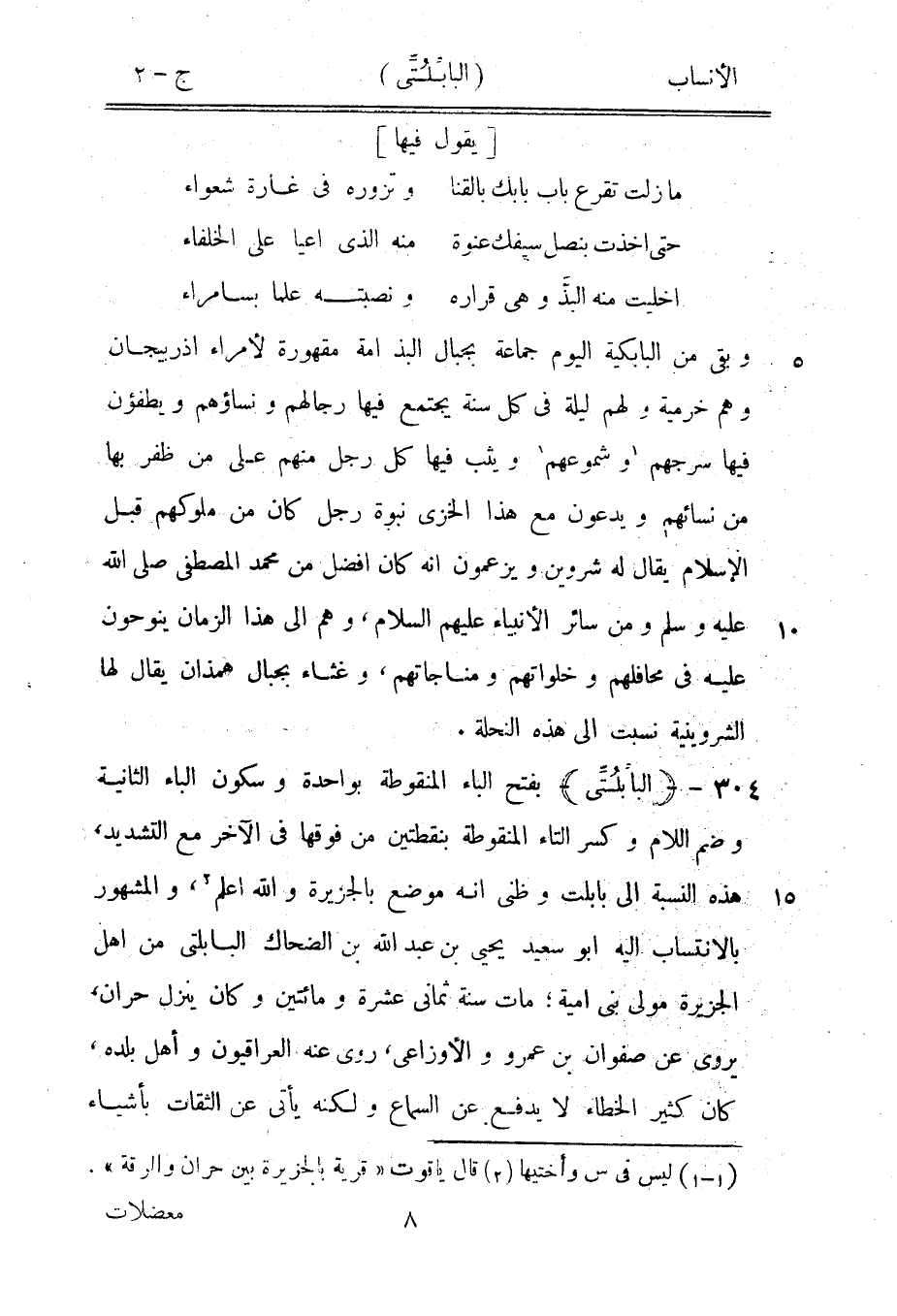 بفتح الباء المنقوطة بواحدة وسكون الباء الثانية وضم اللام وكسر التاء المنقوطة بنقطتين من فوقها في الآخر مع التشديد، هذه النسبة الى بابلت وظني انه موضع بالجزيرة والله اعلم [2] ، والمشهور بالانتساب اليه ابو سعيد يحيى بن عبد الله بن الضحاك البابلتي من أهل الجزيرة مولى بنى أمية، مات سنة ثماني عشرة ومائتين وكان ينزل حران، يروى عن صفوان بن عمرو والأوزاعي، روى عنه العراقيون وأهل بلده، كان كثير الخطاء لا يدفع عن السماع ولكنه يأتى عن الثقات بأشياء