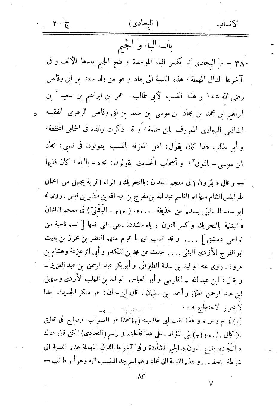 [3] بنى المؤلف على هذا فأعاده في رسم (النجادى) لكن قال هناك «النَجّادى بفتح النون والجيم المشددة وفي آخرها الدال المهملة هذه النسبة الى خياطة اللحف ... وهذه النسبة الى نجاد وهم اسم جد المنتسب اليه وهو أبو طالب-