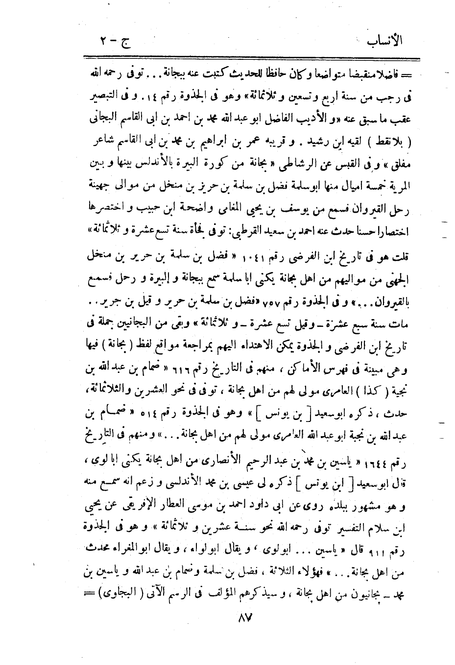 مات سنة سبع عشرة- وقيل تسع عشرة- وثلاثمائة» وبقي من البجانيين جملة في تاريخ ابن الفرضيّ والجذوة يمكن الاهتداء اليهم بمراجعة مواقع لفظ (بجانة) فيها وهي مبينة في فهرس الأماكن، منهم في التاريخ رقم 616 «ضمام بن عبد الله بن نجية (كذا) العامري مولى لهم من أهل بجانة، توفى في نحو العشرين والثلاثمائة، حدث، ذكره ابو سعيد [بن يونس] » وهو في الجذوة رقم 514 «ضمام بن عبد الله بن نجبة ابو عبد الله العامري مولى لهم من أهل بجانة ... » ومنهم في التاريخ رقم 1644 «ياسين بن محمد بن عبد الرحيم الأنصاري من أهل بجانة يكنى ابا لوى، قال ابو سعيد [ابن يونس] ذكره لي عيسى بن محمد الأندلسى وزعم انه سمع منه وهو مشهور ببلده روى عن ابى داود احمد بن موسى العطار الإفريقي عن يحيى ابن سلام التفسير توفى رحمه الله نحو سنة عشرين وثلاثمائة» وهو في الجذوة رقم 911 قال «ياسين ... ابو لوى، ويقال ابو لواء، ويقال ابو المغراء محدث من أهل بجانة ... » فهؤلاء الثلاثة، فضل بن سلمة وضمام بن عبد الله وياسين بن محمد- بجانيون من أهل بجانة، وسيذكرهم المؤلف في الرسم الآتي (البجاوي) -
