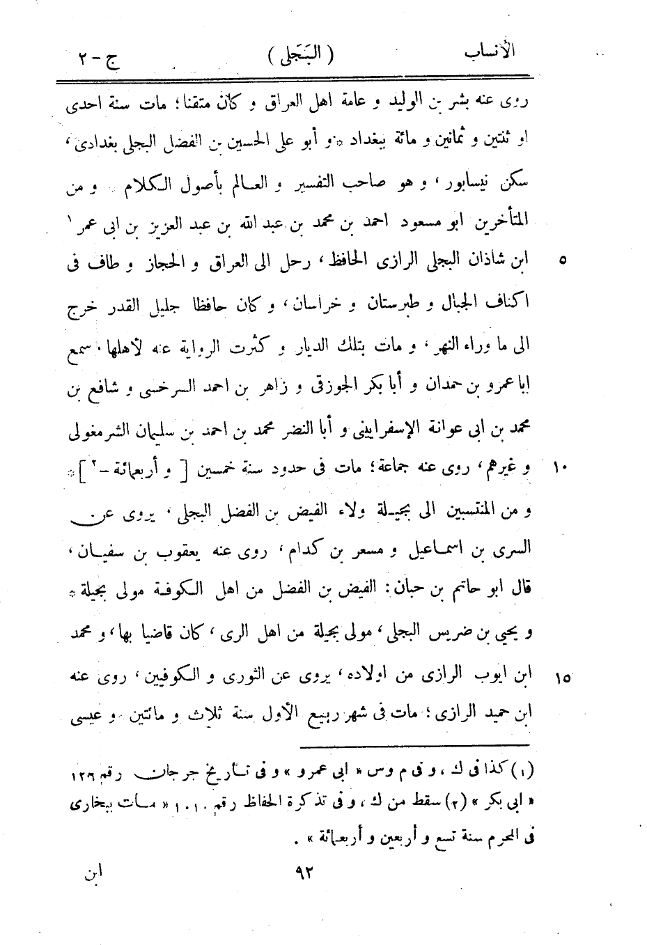 روى عنه بشر بن الوليد وعامة أهل العراق وكان متقنا، مات سنة احدى أو ثنتين وثمانين ومائة ببغداد وأبو على الحسين بن الفضل البجلي بغدادي، سكن نيسابور، وهو صاحب التفسير والعالم بأصول الكلام ومن المتأخرين ابو مسعود احمد بن محمد بن عبد الله بن عبد العزيز بن ابى عمر [1] ابن شاذان البجلي الرازيّ الحافظ، رحل الى العراق والحجاز وطاف في أكناف الجبال وطبرستان وخراسان، وكان حافظا جليل القدر خرج الى ما وراء النهر، ومات بتلك الديار وكثرت الرواية عنه لأهلها، سمع ابا عمرو بن حمدان وأبا بكر الجوزقى وزاهر بن احمد السرخسي وشافع بن محمد بن ابى عوانة الأسفرايينى وأبا النضر محمد بن احمد بن سليمان الشرمغولى وغيرهم، روى عنه جماعة، مات في حدود سنة خمسين [وأربعمائة-[2]] ومن المنتسبين الى بجيلة ولاء الفيض بن الفضل البجلي، يروى عن السري بن إسماعيل ومسعر بن كدام، روى عنه يعقوب بن سفيان، قال ابو حاتم بن حبان: الفيض بن الفضل من أهل الكوفة مولى بجيلة ويحيى بن ضريس البجلي، مولى بجيلة من أهل الري، كان قاضيا بها، ومحمد ابن أيوب الرازيّ من أولاده، يروى عن الثوري والكوفيين، روى عنه ابن حميد الرازيّ، مات في شهر ربيع الأول سنة ثلاث ومائتين وعيسى