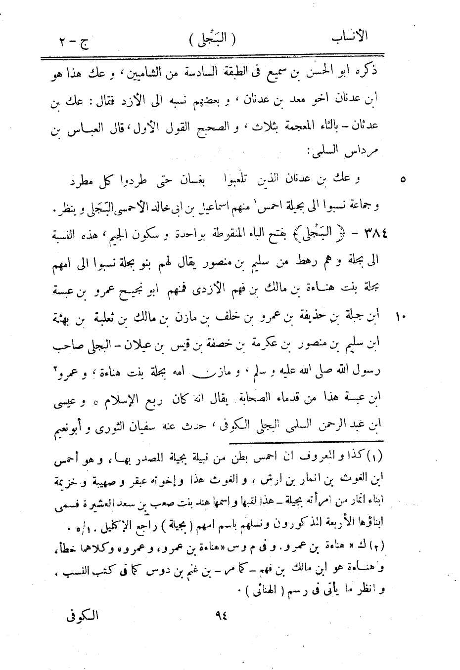 بفتح الباء المنقوطة بواحدة وسكون الجيم، هذه النسبة الى بجلة وهم رهط من سليم بن منصور يقال لهم بنو بجلة نسبوا الى أمهم بجلة بنت هناءة بن مالك بن فهم الأزدي فمنهم ابو نجيح عمرو بن عبسة ابن جبلة بن حذيفة بن عمرو بن خلف بن مازن بن مالك بن ثعلبة بن بهثة ابن سليم بن منصور بن عكرمة بن خصفة بن قيس بن عيلان- البجلي صاحب رسول الله صلى الله عليه وسلم، ومازن امه بجلة بنت هناءة، وعمرو [2] ابن عبسة هذا من قدماء الصحابة يقال انه كان ربع الإسلام وعيسى ابن عبد الرحمن السلمي البجلي الكوفي، حدث عنه سفيان الثوري وأبو نعيم