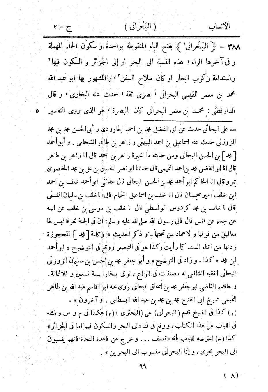 [1] بفتح الباء المنقوطة بواحدة وسكون الحاء المهملة وفي آخرها الراء، هذه النسبة الى البحر أو إلى الجزائر والسكون فيها [2] واستدامة ركوب البحار أو كان ملاح السفن [3] ، والمشهور بها ابو عبد الله محمد بن معمر القيسي البحراني، بصرى ثقة، حدث عنه البخاري، وقال الدارقطنيّ: محمد بن معمر البحراني كان بالبصرة، هو الّذي روى التفسير