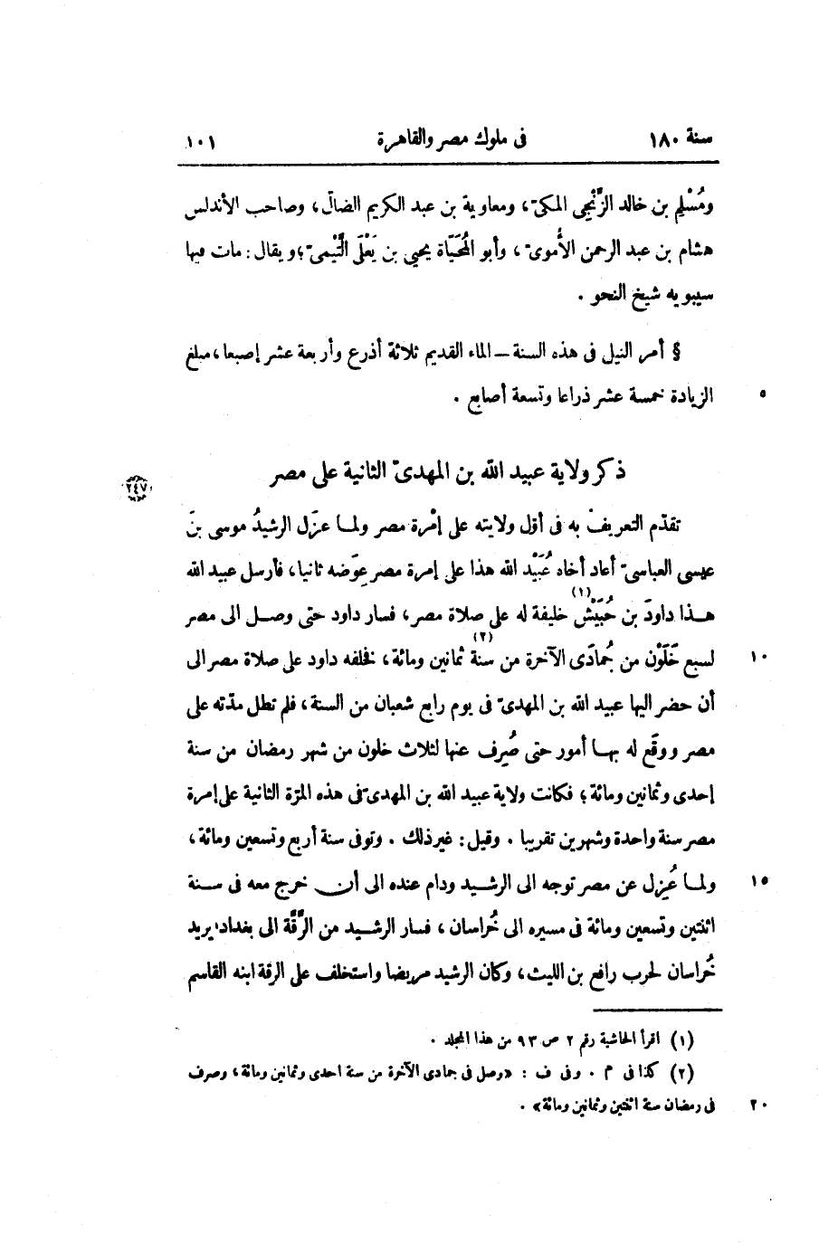 تقدم التعريف به في أول ولايته على إمرة مصر ولما عزل الرشيد موسى بن عيسى العباسي أعاد أخاه عبيد الله هذا على إمرة مصر عوضه ثانياً، فأرسل عبيد الله هذا داود بن حبيش «1» خليفة له على صلاة مصر، فسار داود حتى وصل إلى مصر لسبع خلون من جمادى الآخرة من سنة «2» ثمانين ومائة، فخلفه داود على صلاة مصر إلى أن حضر إليها عبيد الله بن المهدي في يوم رابع شعبان من السنة، فلم تطل مدته على مصر ووقع له بها أمور حتى صرف عنها لثلاث خلون من شهر رمضان من سنة إحدى وثمانين ومائة؛ فكانت ولاية عبيد الله بن المهدي في هذه المرة الثانية على إمرة مصر سنة واحدة وشهرين تقريباً. وقيل: غير ذلك. وتوفي سنة أربع وتسعين ومائة، ولما عزل عن مصر توجه إلى الرشيد ودام عنده إلى أن خرج معه في سنة اثنتين وتسعين ومائة في مسيره إلى خراسان، فسار الرشيد من الرقة إلى بغداد يريد خراسان لحرب رافع بن الليث، وكان الرشيد مريضاً واستخلف على الرقة ابنه القاسم