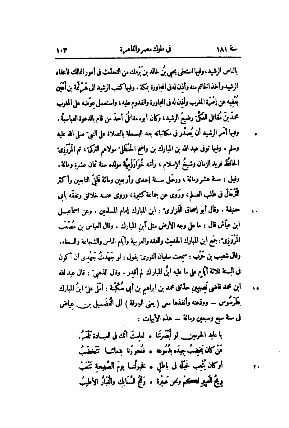 وفيها أمر الرشيد أن يصدر في مكاتباته بعد البسملة بالصلاة على النبي صلى الله عليه وسلم. وفيها توفي عبد الله بن المبارك بن واضح الحنظلي مولاهم التركي، ثم المروزي الحافظ فريد الزمان وشيخ الإسلام، وأمه خوارزمية مولده سنة ثمان عشرة ومائة.