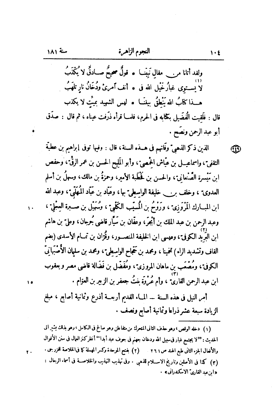 الذين ذكر الذهبي وفاتهم في هذه السنة، قال: وفيها توفي إبراهيم بن عطيّة الثقفىّ، واسماعيل بن عيّاش الحمصىّ، وأبو المليح الحسن بن عمر الرقّىّ، وحفص ابن ميسرة الصنعاني، والحسن بن قحطبة الأمير، وحمزة بن مالك، وسهل بن أسلم العدوي، وخلف بن خليفة الواسطي بها، وعباد بن عباد المهلّبىّ، وعبد الله ابن المبارك المروزي، وروح بن المسيب الكلبي، وسهيل بن صبرة العجلي، وعبد الرحمن بن عبد الملك بن أبجر، وعفان بن سيار قاضي جرجان، وعلىّ بن هاشم ابن البريد «2» الكوفي، وعيسى ابن الخليفة المنصور، وقران بن تمام الأسدي (بضم القاف وتشديد الراء) تخمينا، ومحمد بن حجّاح الواسطي، ومحمد بن سليمان الأصبهاني الكوفي، ومصعب بن ماهان المروزي، ومفضل بن فضالة قاضي مصر ويعقوب ابن عبد الرحمن القاري «3» ، وأم عروة بنت جعفر بن الزبير بن العوام.