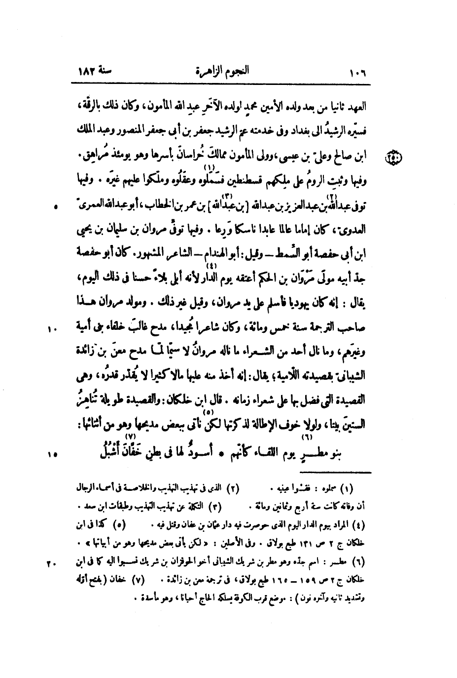 وفيها وثبت الروم على ملكهم قسطنطين فسملوه «1» وعقلوه وملكوا عليهم غيره. وفيها توفي عبد الله «2» بن عبد العزيز بن عبد الله [بن عبد «3» الله] بن عمر بن الخطاب، أبو عبد الله العمري العدوي، كان إماماً عالماً عابداً ناسكاً ورعاً. وفيها توفي مروان بن سليمان بن يحيى ابن أبى حفصة أبو السّمط- وقيل: أبو الهندام- الشاعر المشهور. كان أبو حفصة جد أبيه مولى مروان بن الحكم أعتقه يوم الدار «4» لأنه أبلى بلاء حسنا في ذلك اليوم، يقال: إنه كان يهودياً فأسلم على يد مروان، وقيل غير ذلك. ومولد مروان هذا صاحب الترجمة سنة خمس ومائة، وكان شاعراً مجيداً، مدح غالب خلفاء بني أمية وغيرهم، وما نال أحد من الشعراء ما ناله مروان لا سيما لما مدح معن بن زائدة الشيباني بقصيدته اللامية؛ يقال: إنه أخذ منه عليها مالاً كثيراً لا يقدر قدره، وهي القصيدة التي فضل بها على شعراء زمانه. قال ابن خلكان: والقصيدة طويلة تناهز الستين بيتاً، ولولا خوف الإطالة لذكرتها لكن «5» نأتي ببعض مديحها وهو من أثنائها: