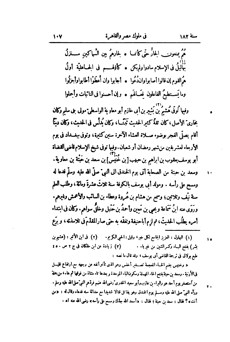 وفيها توفي هشيم «2» بن بشير بن أبي خازم أبو معاوية الواسطي مولى بني سليم وكان بخاري الأصل، كان ثقة كثير الحديث ثبتاً، وكان يدلس في الحديث، وكان ديناً أقام يصلي الفجر بوضوء صلاة العشاء الآخرة سنين كثيرة، وتوفي ببغداد في يوم الأربعاء لعشر بقين من شهر رمضان أو شعبان. وفيها توفي شيخ الإسلام قاضي القضاة أبو يوسف يعقوب بن إبراهيم بن حبيب [بن خنيس «3» ] بن سعد بن حبتة بن معاوية.