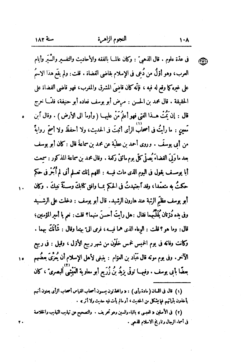 في عدة علوم. قال الذهبي: وكان عالماً بالفقه والأحاديث والتفسير والسير وأيام العرب، وهو أول من دعي في الإسلام بقاضي القضاة. قلت: ولم يقع هذا الاسم على غيره كما وقع له فيه، فإنه كان قاضي المشرق والمغرب، فهو قاضي القضاة على الحقيقة. قال محمد بن الحسن: مرض أبو يوسف فعاده أبو حنيفة، فلمّا خرج قال: إن يمت هذا الفتى فهو أعلم من عليها (وأومأ إلى الأرض) . وقال ابن معين: ما رأيت في أصحاب «1» الرأي أثبت في الحديث، ولا أحفظ ولا أصح رواية من أبي يوسف. وروى أحمد بن عطية عن محمد بن سماعة قال: كان أبو يوسف بعد ما ولي القضاء يصلي كل يوم مائتي ركعة. وقال محمد بن سماعة المذكور: سمعت أبا يوسف يقول في اليوم الذي مات فيه: اللهم إنك تعلم أني لم أجر في حكم حكمت به متعمدا، وقد اجتهدت في الحكم بما وافق كتابك وسنة نبيك. وكان أبو يوسف عظيم الرتبة عند هارون الرشيد. قال أبو يوسف: دخلت على الرشيد وفي يده درتان يقلبهما فقال: هل رأيت أحسن منهما؟ قلت: نعم يا أمير المؤمنين؛ قال: وما هو؟ قلت: الوعاء الذي هما فيه، فرمى إلي بهما وقال: شأنك بهما.