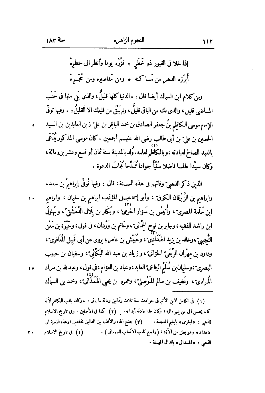 ومن كلام ابن السماك أيضاً قال: «الدنيا كلها قليل، والذي بقي منها في جنب الماضي قليل، والذي لك من الباقي قليل، ولم يبق من قليلك إلا القليل» . وفيها توفي الإمام موسى الكاظم بن جعفر الصادق بن محمد الباقر بن علي زين العابدين بن السيد الحسين بن علي بن أبي طالب رضي الله عنهم أجمعين. كان موسى المذكور يدعى بالعبد الصالح لعبادته، وبالكاظم «1» لعلمه. ولد بالمدينة سنة ثمان أو تسع وعشرين ومائة، وكان سيداً عالماً فاضلاً سنياً جواداً ممدحاً مجاب الدعوة.
