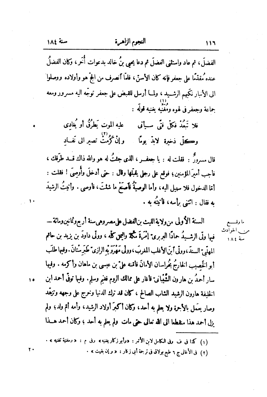 السنة الأولى من ولاية الليث بن الفضل على مصر وهي سنة أربع وثمانين ومائة- فيها ولى الرشيد حماداً البربري إمرة مكة واليمن كله، وولى داود بن يزيد بن حاتم المهلبي السند، وولى ابن الأغلب المغرب، وولى مهرويه الرازي طبرستان. وفيها طلب أبو الخصيب الخارج بخراسان الأمان فأمنه علي بن عيسى بن ماهان وأكرمه. وفيها سار أحمد بن هارون الشيباني فأغار على ممالك الروم فغنم وسلم. وفيها توفي أحمد ابن الخليفة هارون الرشيد الشاب الصالح، كان قد ترك الدنيا وخرج على وجهه وتزهد وصار يعمل بالأجرة ولا يعلم به أحد، وكان أكبر أولاد الرشيد، وأمه أم ولد؛ ولم يزل أحمد هذا منقطعا إلى الله تعالى حتى مات ولم يعلم به أحد؛ وكان أحمد هذا